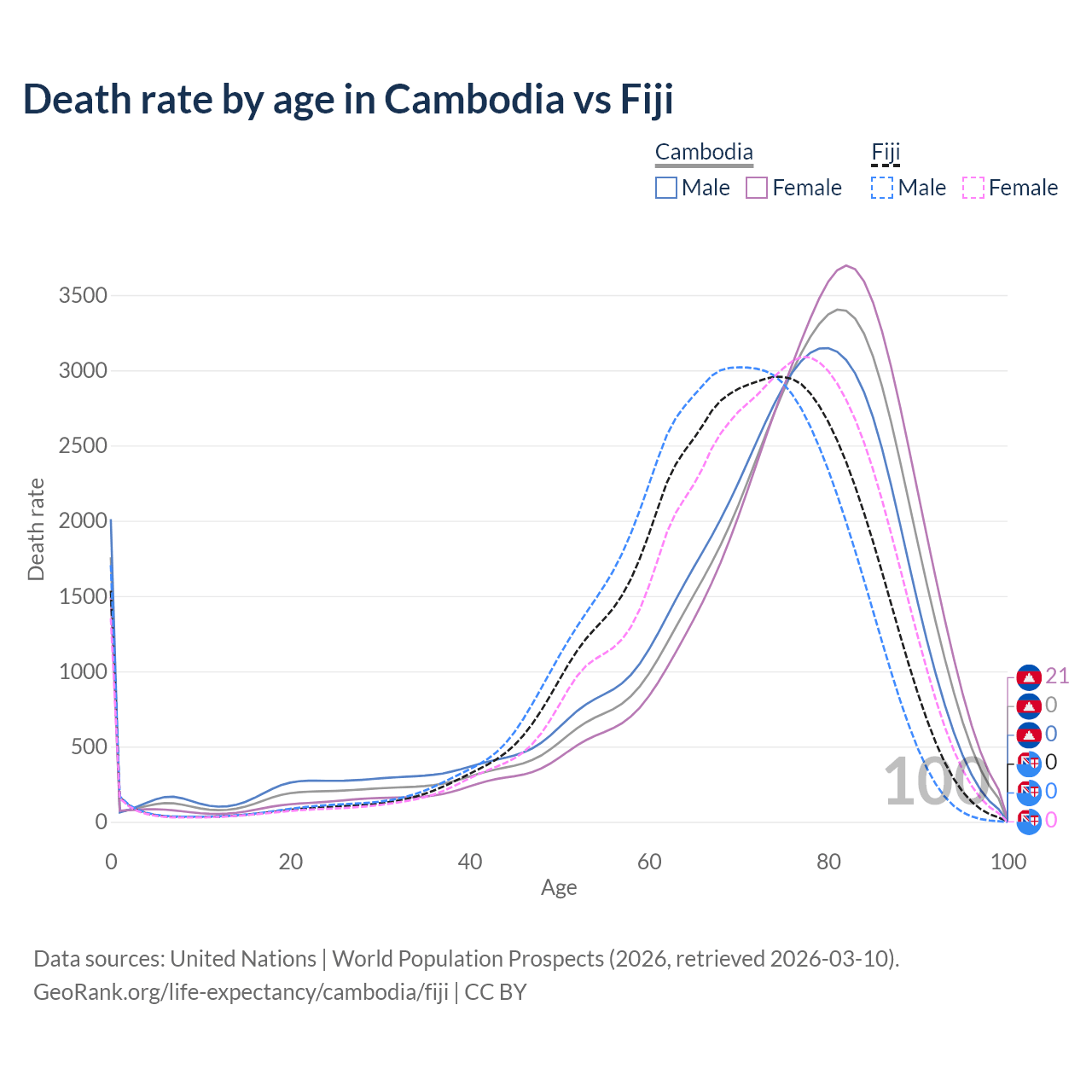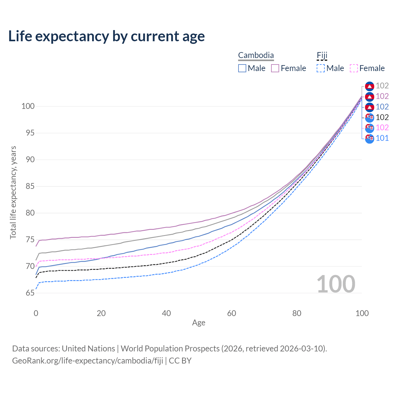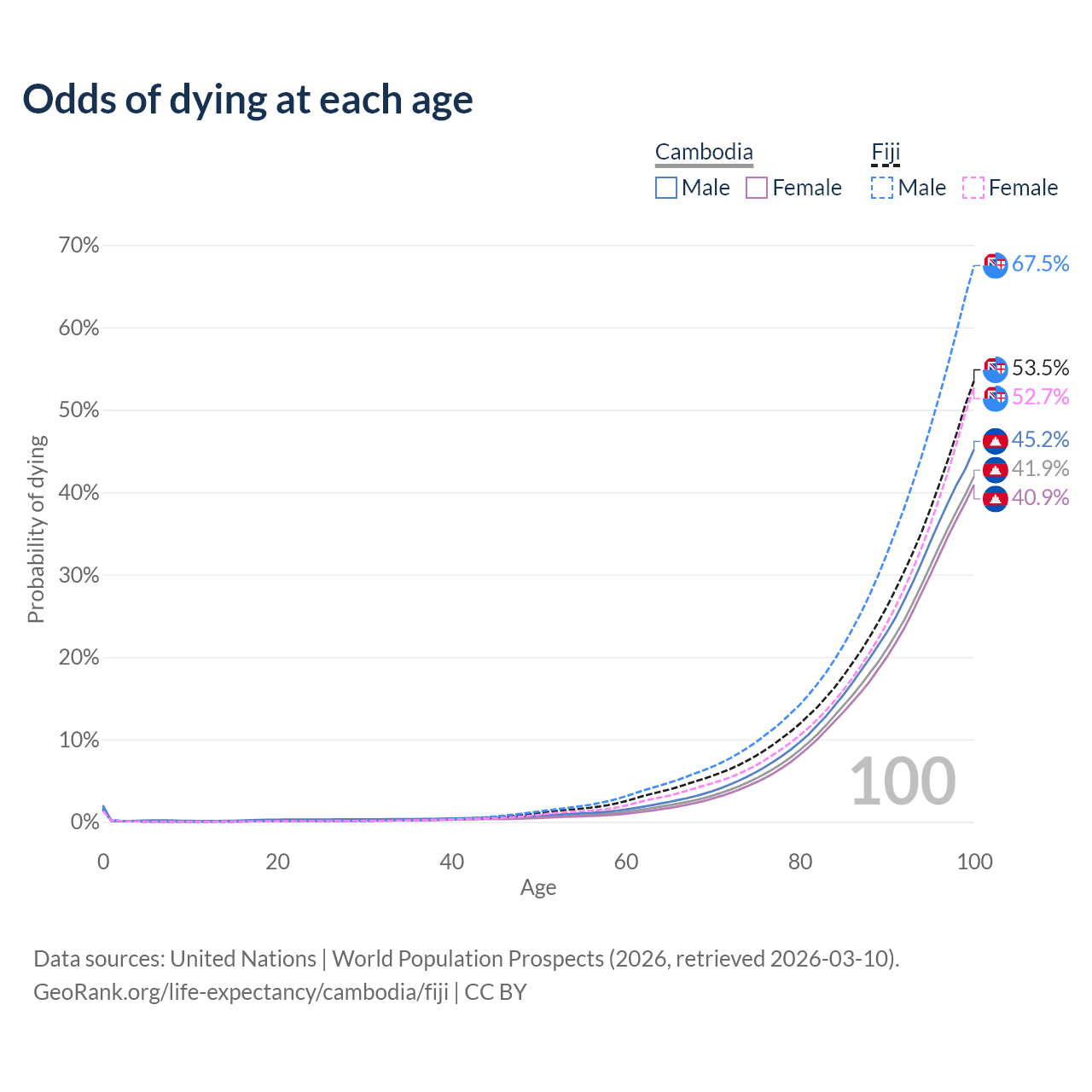 This life expectancy calculator shows the odds of living to 100, 95, 90, and below based on current age for both males and females in Cambodia and Fiji, along with mean and median age of death. The calculations are based on the 2026 life tables (actuarial tables) from the UN World Population Prospects.