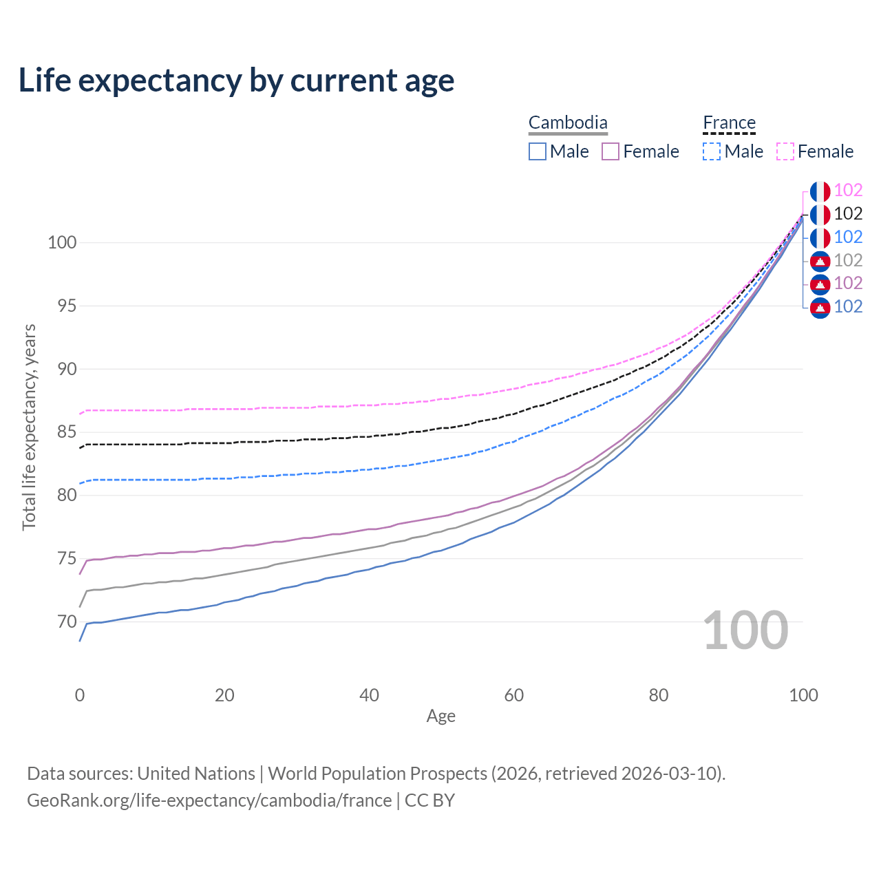 This life expectancy calculator shows the odds of living to 100, 95, 90, and below based on current age for both males and females in Cambodia and France, along with mean and median age of death. The calculations are based on the 2026 life tables (actuarial tables) from the UN World Population Prospects.