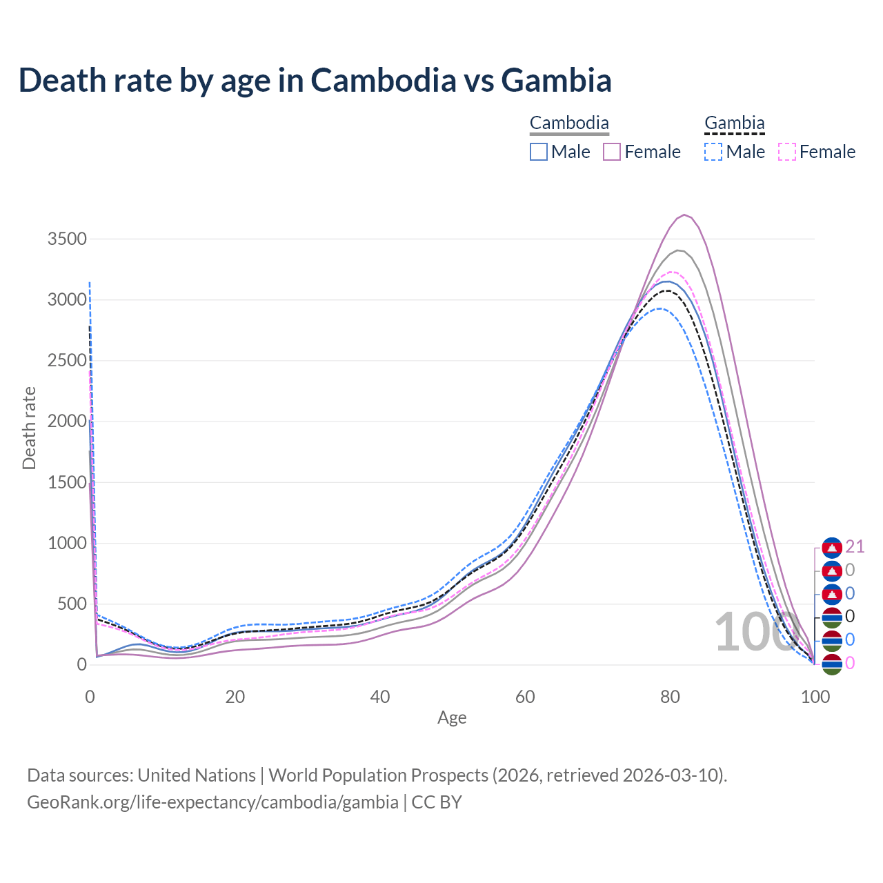 This life expectancy calculator shows the odds of living to 100, 95, 90, and below based on current age for both males and females in Cambodia and the Gambia, along with mean and median age of death. The calculations are based on the 2026 life tables (actuarial tables) from the UN World Population Prospects.