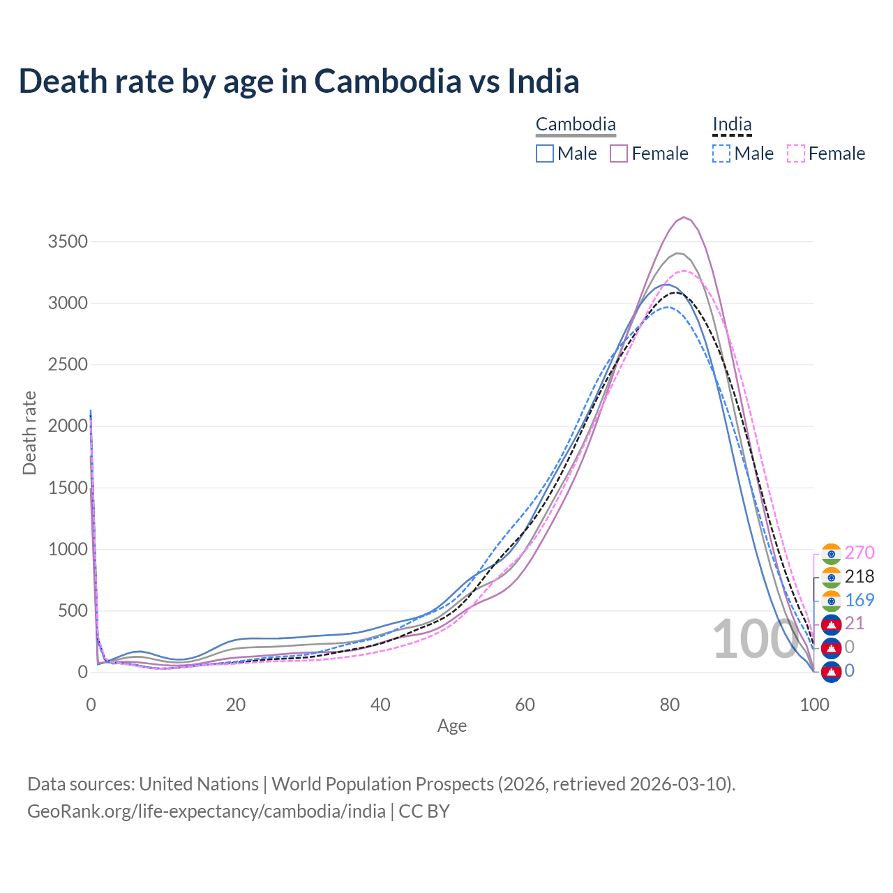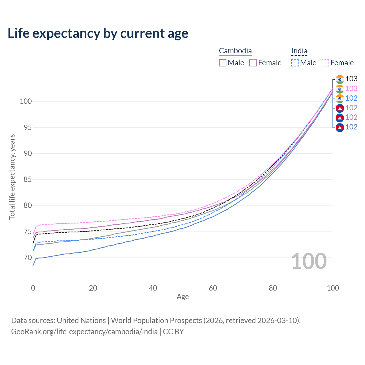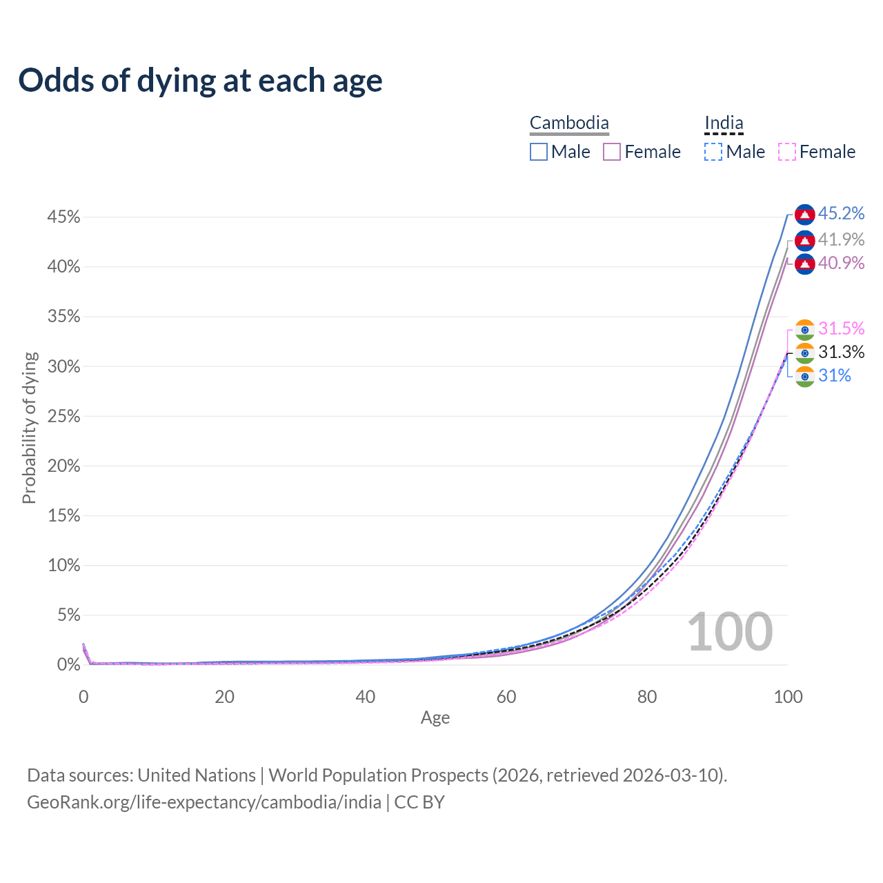 This life expectancy calculator shows the odds of living to 100, 95, 90, and below based on current age for both males and females in Cambodia and India, along with mean and median age of death. The calculations are based on the 2026 life tables (actuarial tables) from the UN World Population Prospects.