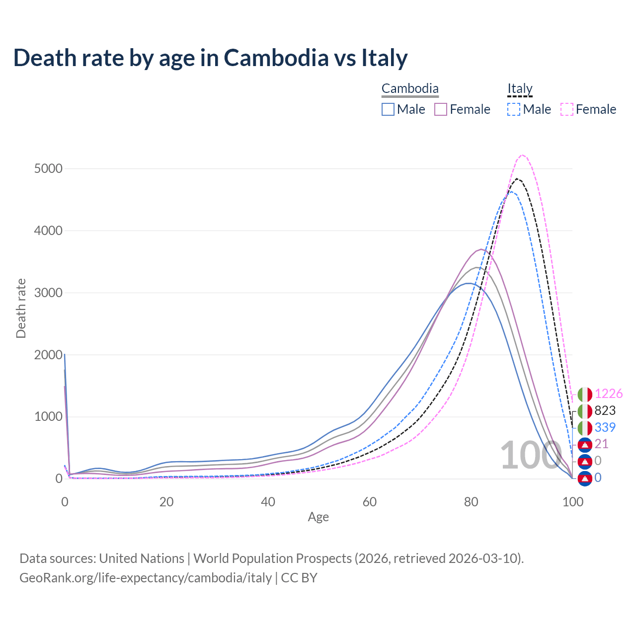 This life expectancy calculator shows the odds of living to 100, 95, 90, and below based on current age for both males and females in Cambodia and Italy, along with mean and median age of death. The calculations are based on the 2026 life tables (actuarial tables) from the UN World Population Prospects.