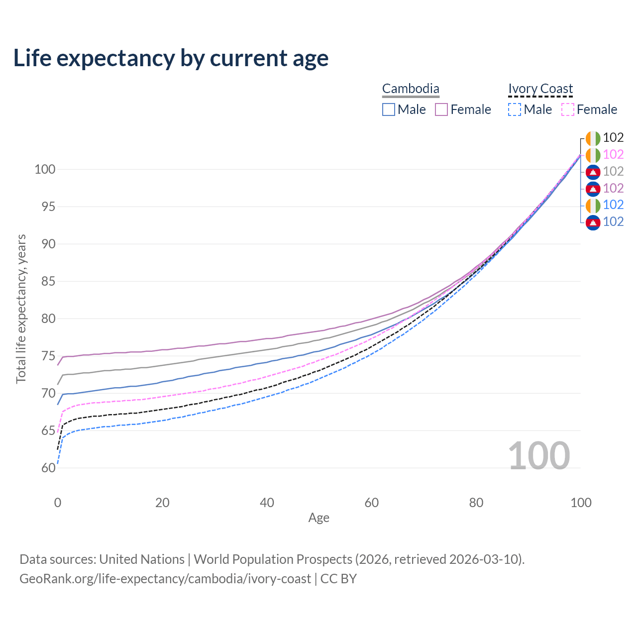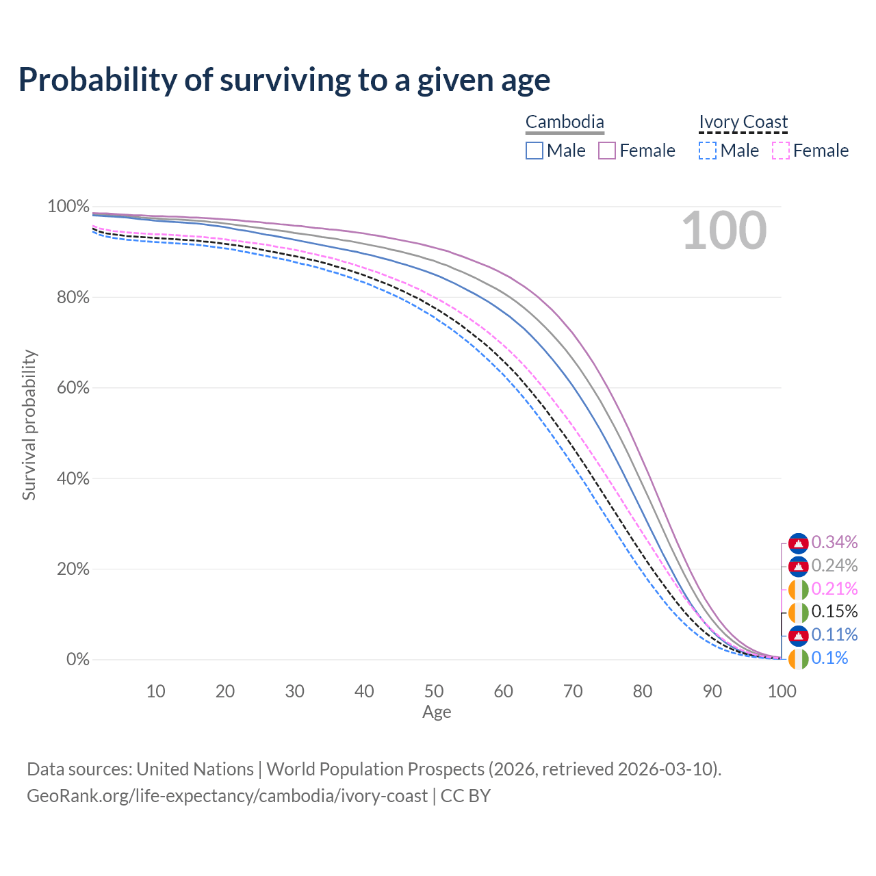 This life expectancy calculator shows the odds of living to 100, 95, 90, and below based on current age for both males and females in Cambodia and Ivory Coast, along with mean and median age of death. The calculations are based on the 2026 life tables (actuarial tables) from the UN World Population Prospects.