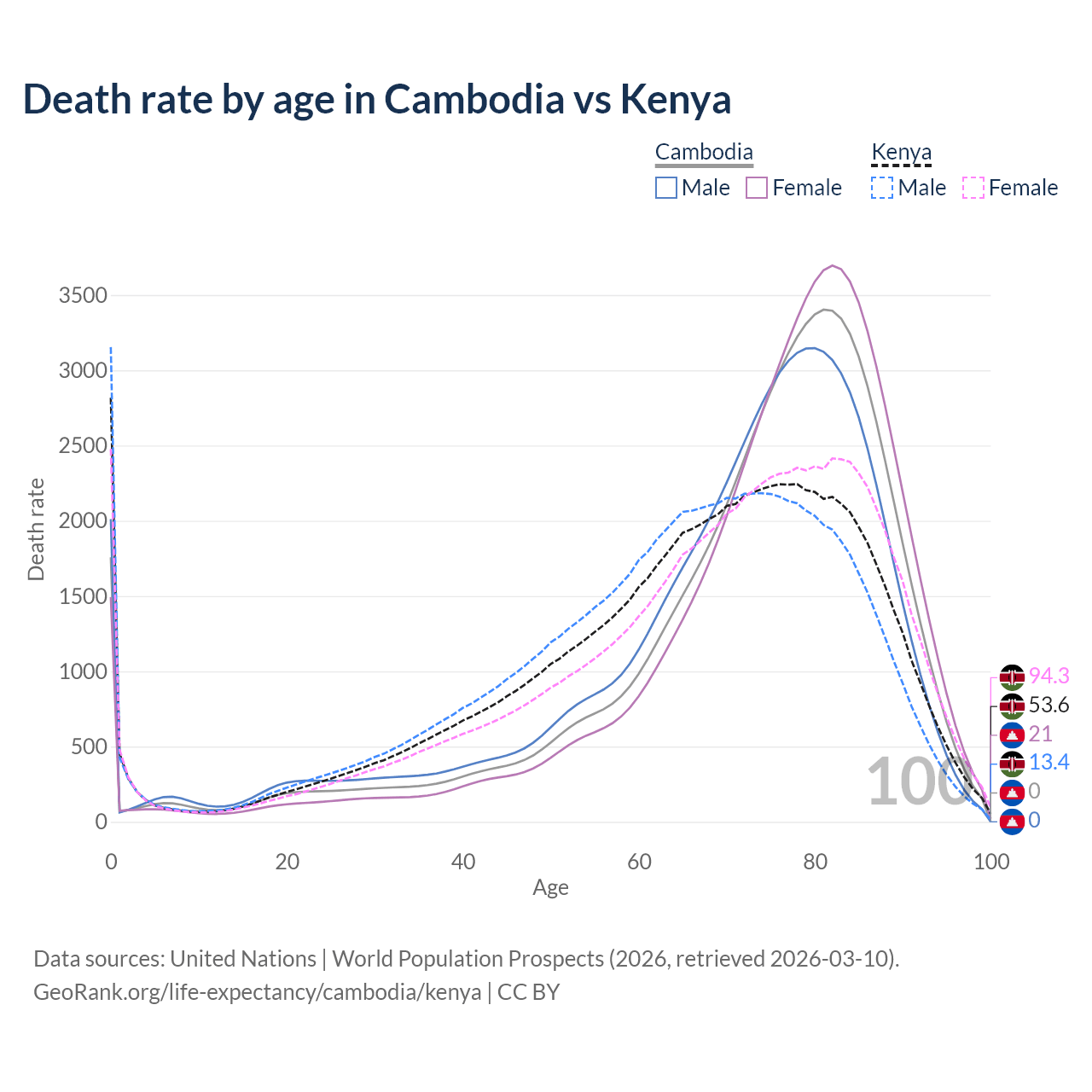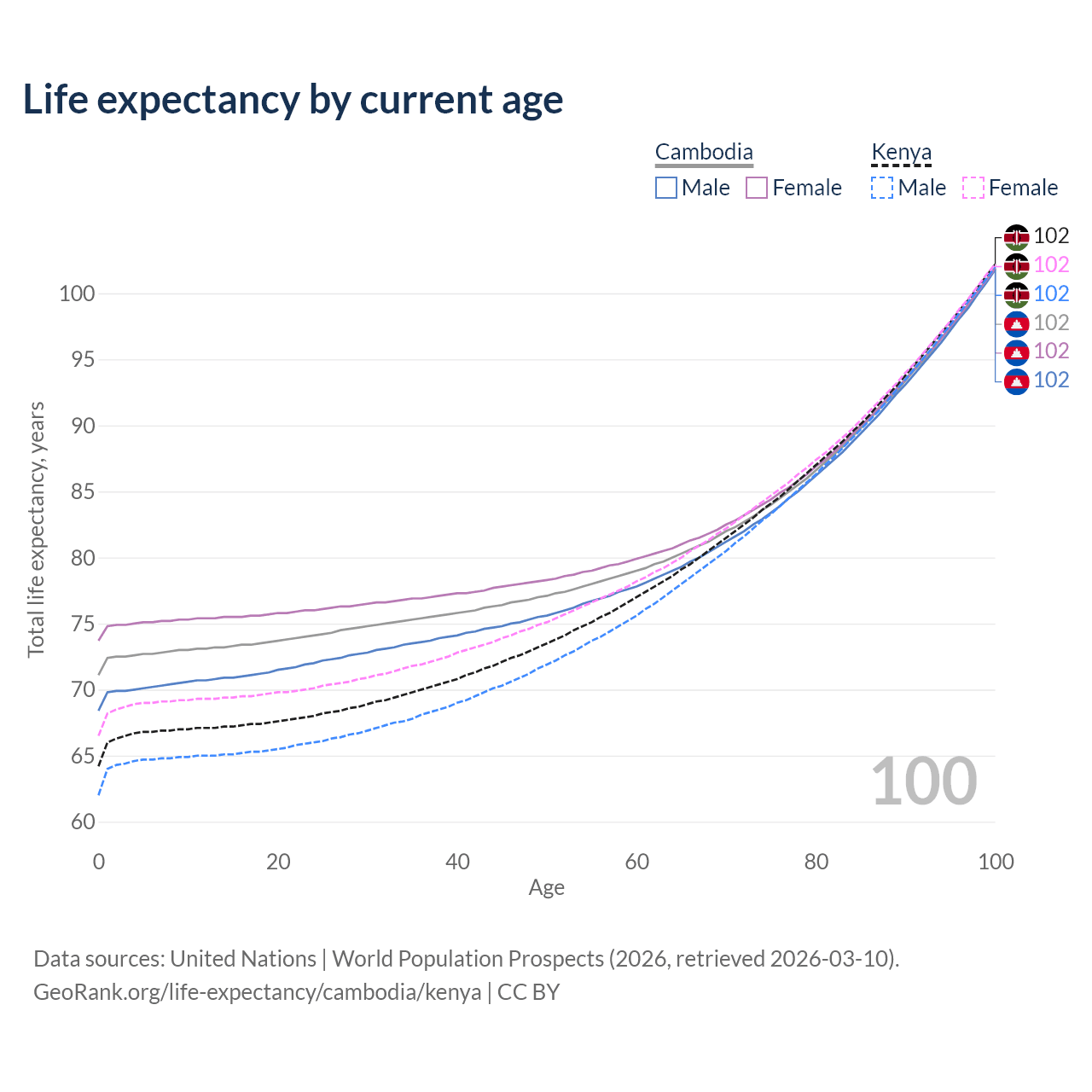 This life expectancy calculator shows the odds of living to 100, 95, 90, and below based on current age for both males and females in Cambodia and Kenya, along with mean and median age of death. The calculations are based on the 2026 life tables (actuarial tables) from the UN World Population Prospects.