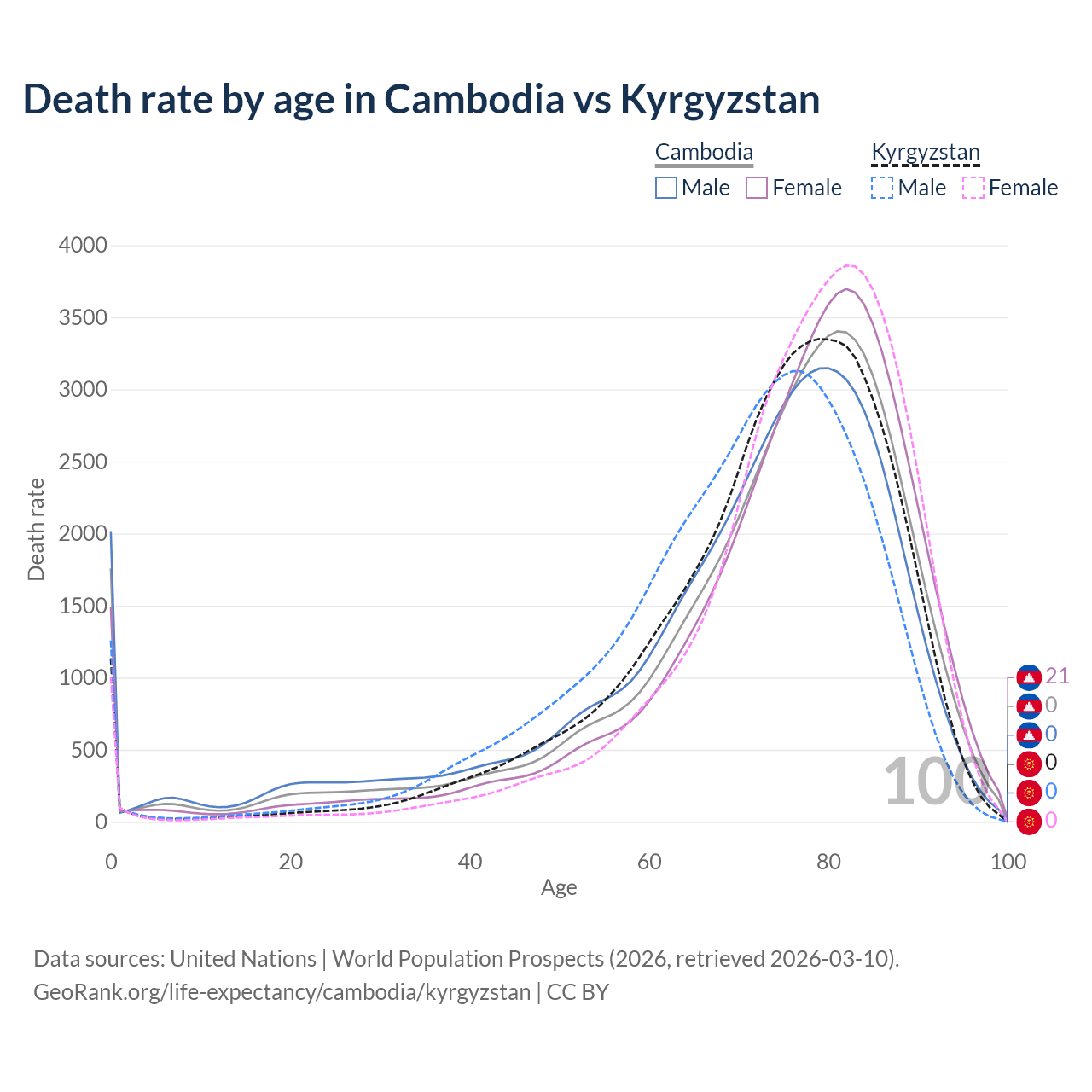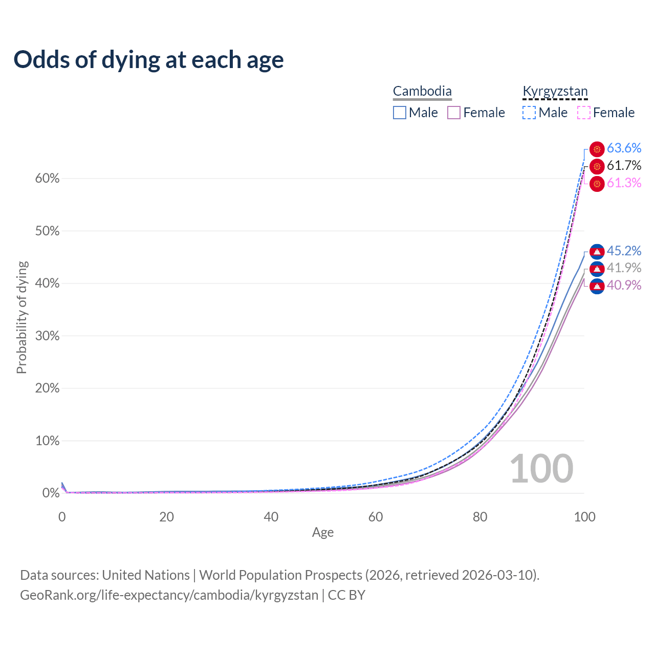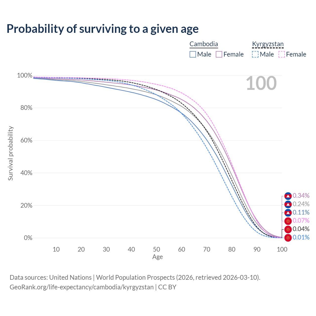 This life expectancy calculator shows the odds of living to 100, 95, 90, and below based on current age for both males and females in Cambodia and Kyrgyzstan, along with mean and median age of death. The calculations are based on the 2026 life tables (actuarial tables) from the UN World Population Prospects.