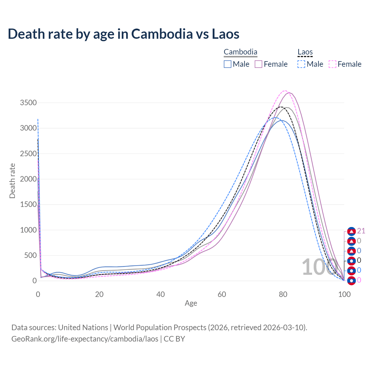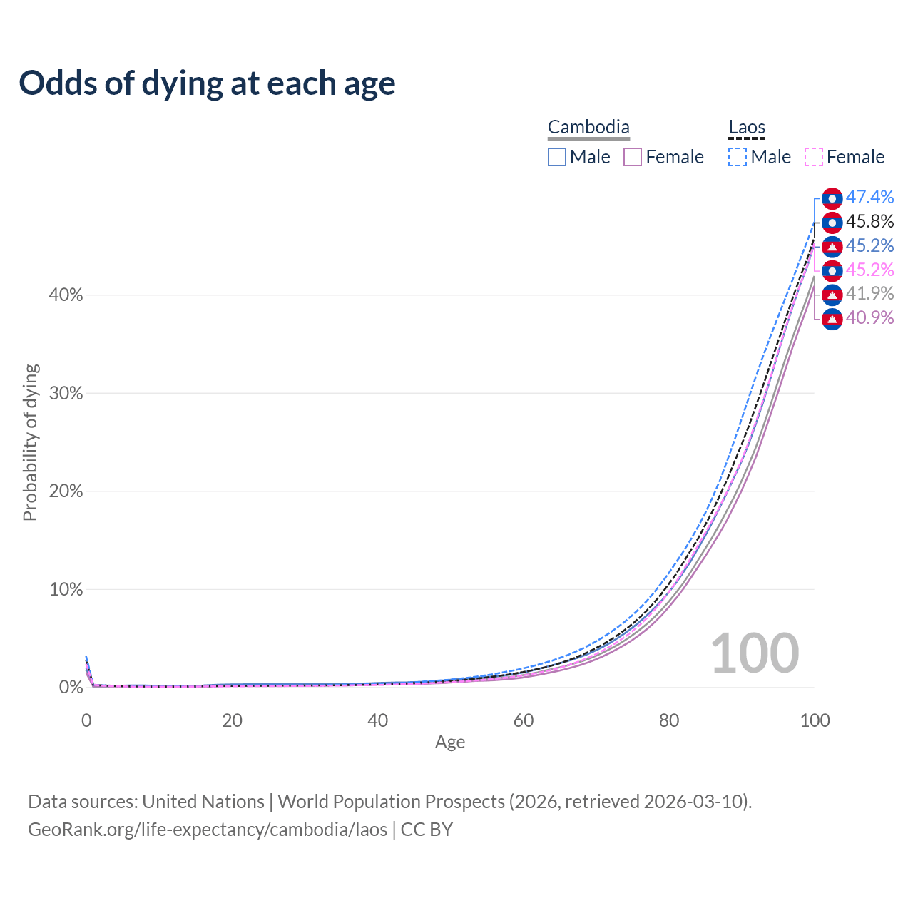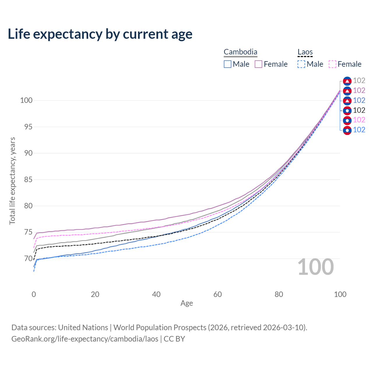 This life expectancy calculator shows the odds of living to 100, 95, 90, and below based on current age for both males and females in Cambodia and Laos, along with mean and median age of death. The calculations are based on the 2026 life tables (actuarial tables) from the UN World Population Prospects.