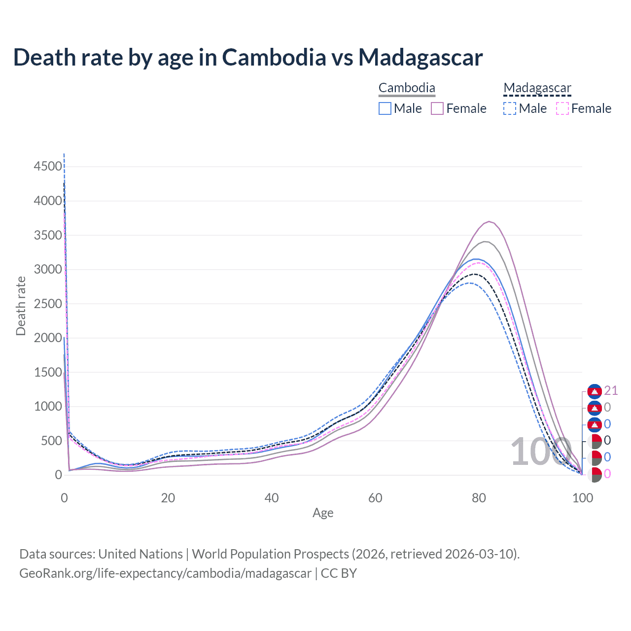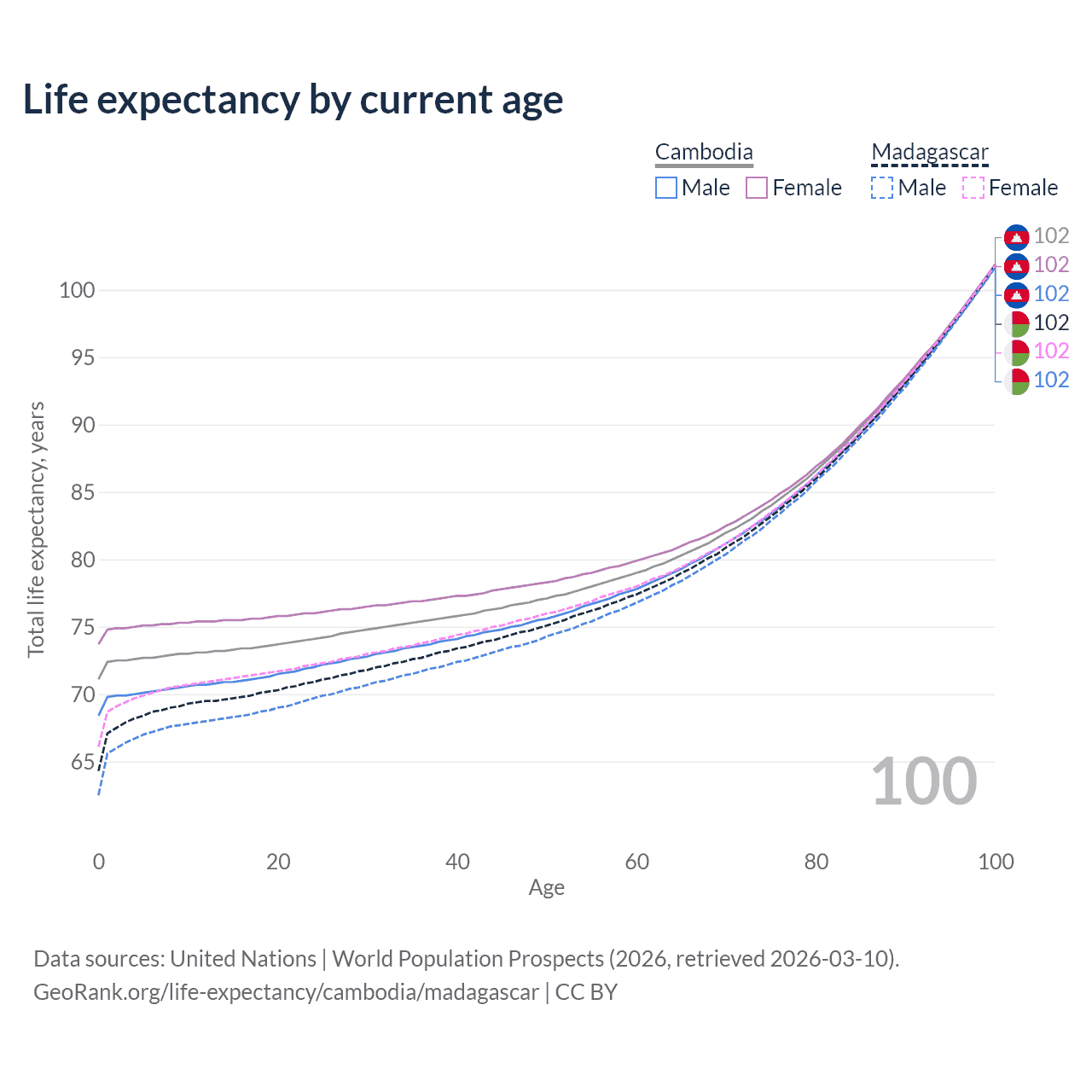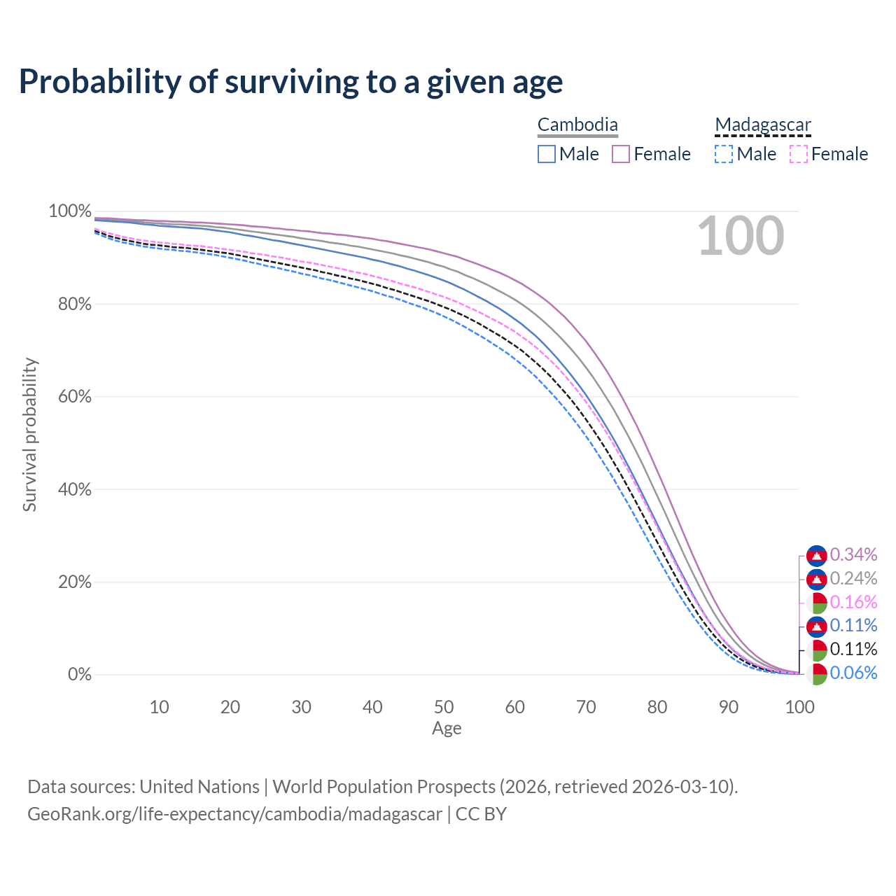 This life expectancy calculator shows the odds of living to 100, 95, 90, and below based on current age for both males and females in Cambodia and Madagascar, along with mean and median age of death. The calculations are based on the 2026 life tables (actuarial tables) from the UN World Population Prospects.