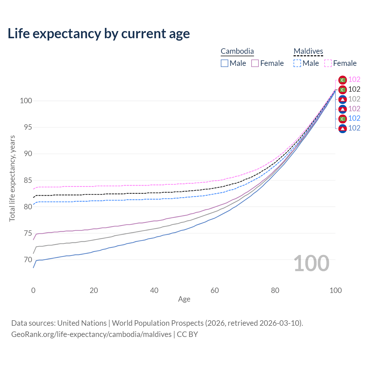 This life expectancy calculator shows the odds of living to 100, 95, 90, and below based on current age for both males and females in Cambodia and Maldives, along with mean and median age of death. The calculations are based on the 2026 life tables (actuarial tables) from the UN World Population Prospects.