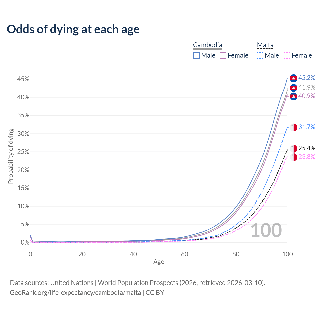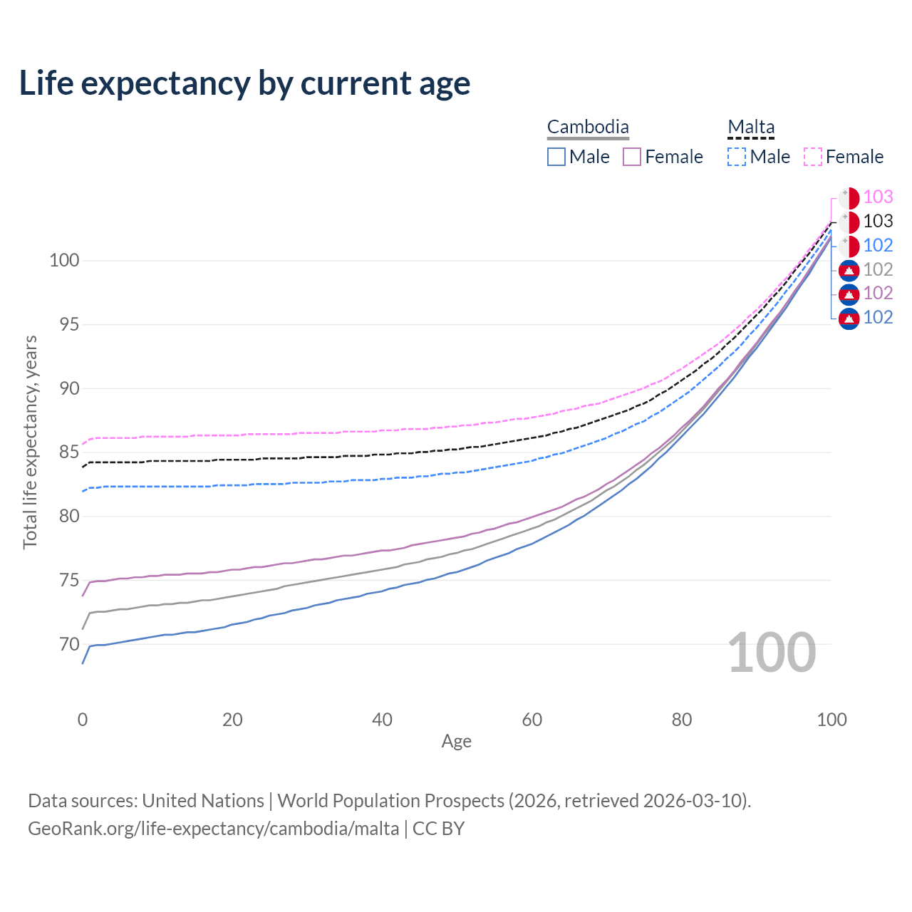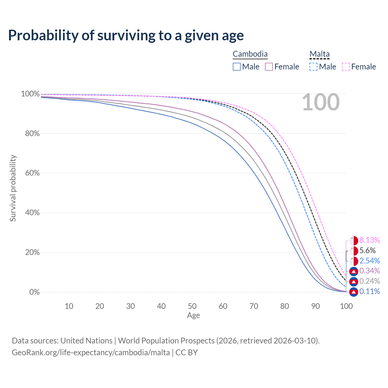 This life expectancy calculator shows the odds of living to 100, 95, 90, and below based on current age for both males and females in Cambodia and Malta, along with mean and median age of death. The calculations are based on the 2026 life tables (actuarial tables) from the UN World Population Prospects.