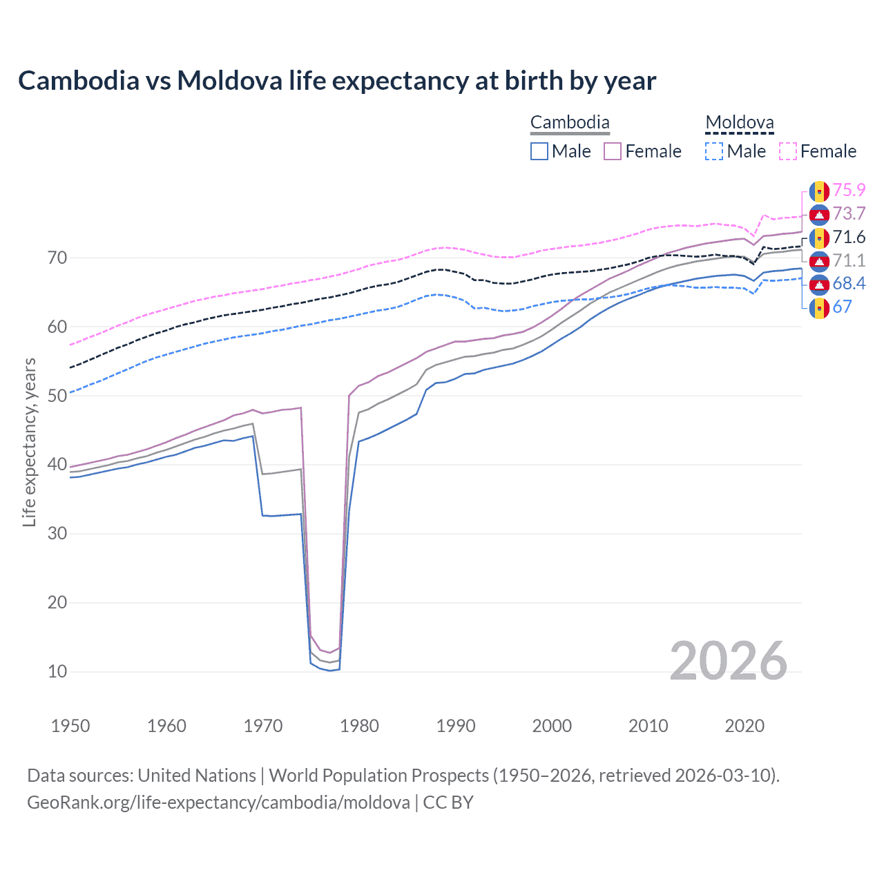 The average life expectancy at birth is 71.1 years in Cambodia vs 71.6 in Moldova. Cambodia is ranked 132/197 by life expectancy, and Moldova is 129/197. In Cambodia, the life expectancy is 68.4 years for males and 73.7 years for females. In Moldova, it's 67 years for males and 75.9 years for females.