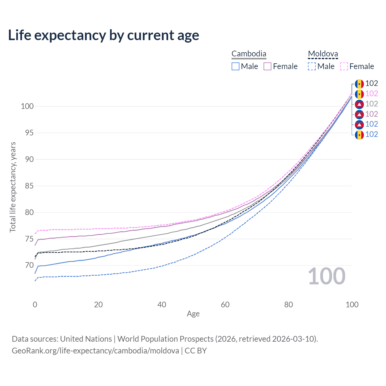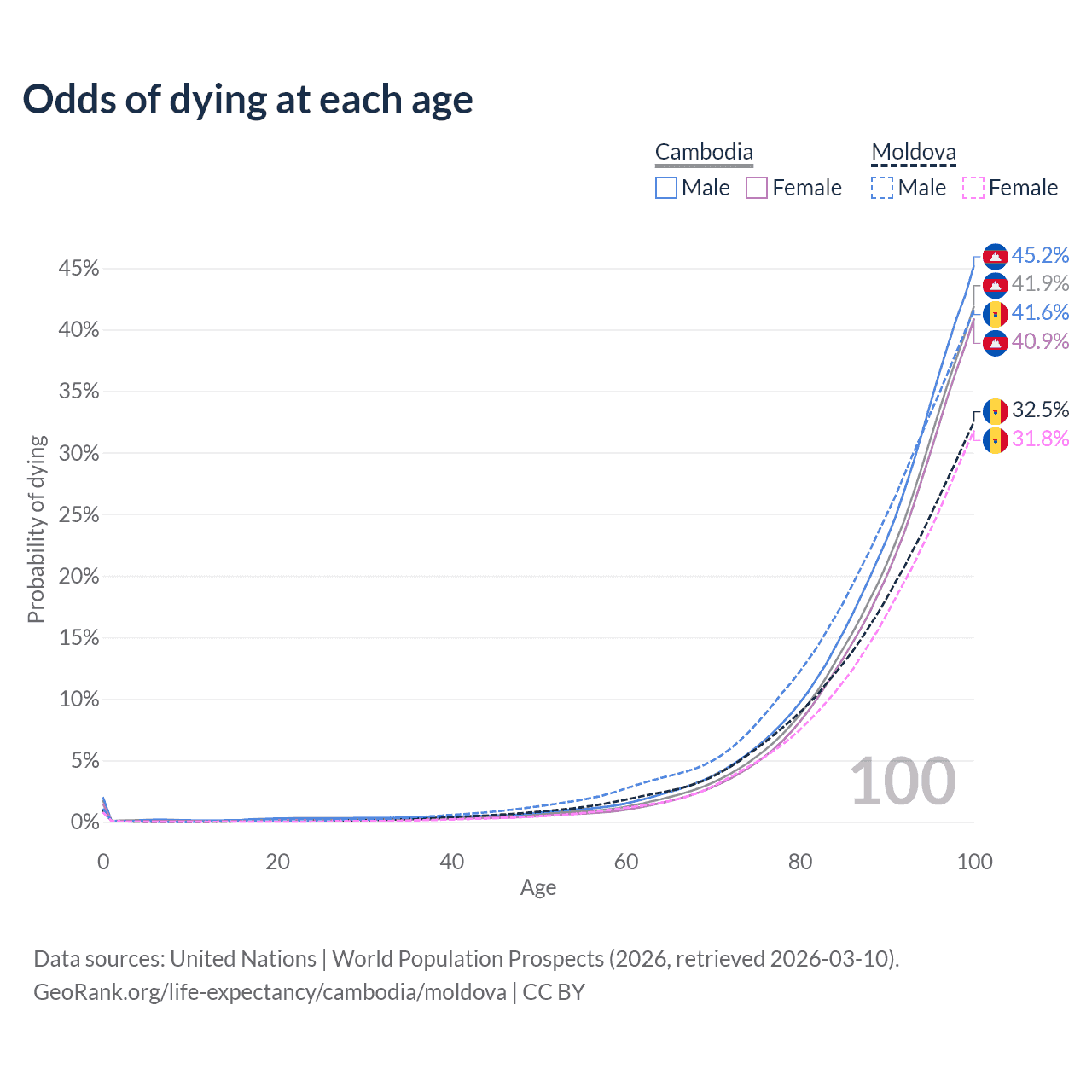 This life expectancy calculator shows the odds of living to 100, 95, 90, and below based on current age for both males and females in Cambodia and Moldova, along with mean and median age of death. The calculations are based on the 2026 life tables (actuarial tables) from the UN World Population Prospects.