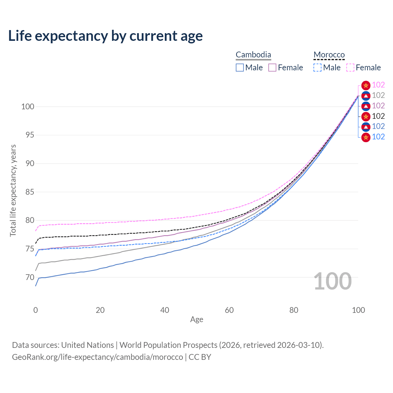 This life expectancy calculator shows the odds of living to 100, 95, 90, and below based on current age for both males and females in Cambodia and Morocco, along with mean and median age of death. The calculations are based on the 2026 life tables (actuarial tables) from the UN World Population Prospects.