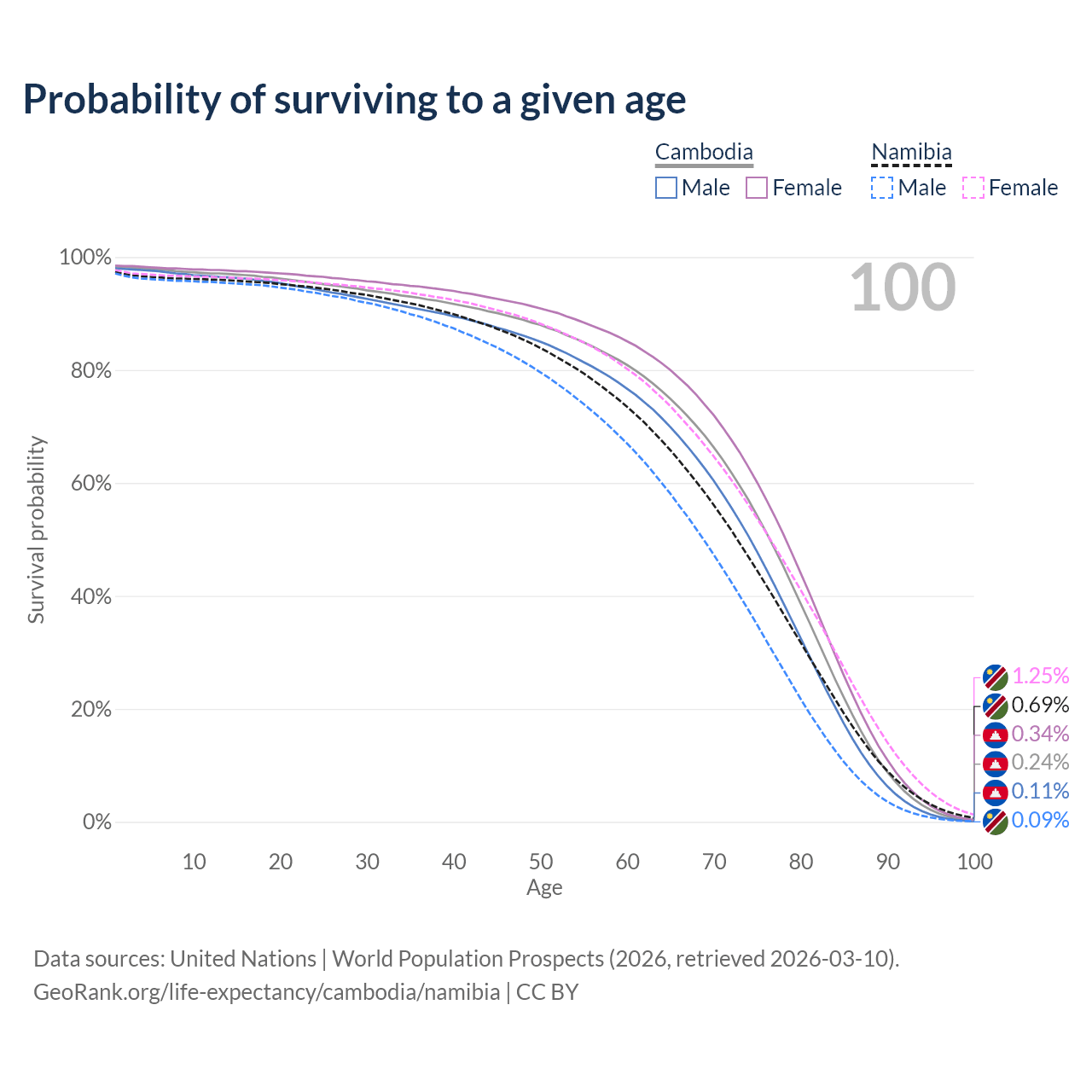 This life expectancy calculator shows the odds of living to 100, 95, 90, and below based on current age for both males and females in Cambodia and Namibia, along with mean and median age of death. The calculations are based on the 2026 life tables (actuarial tables) from the UN World Population Prospects.