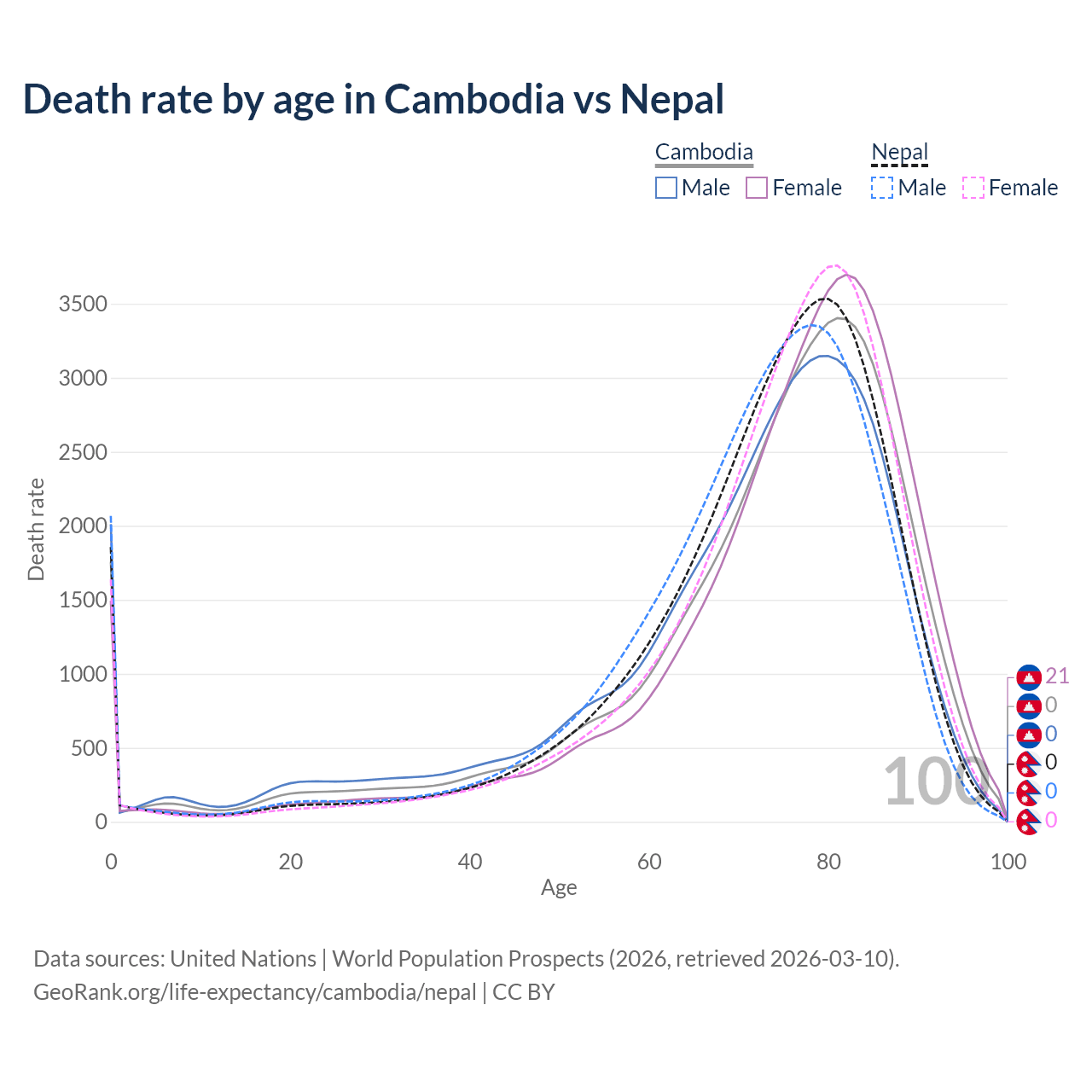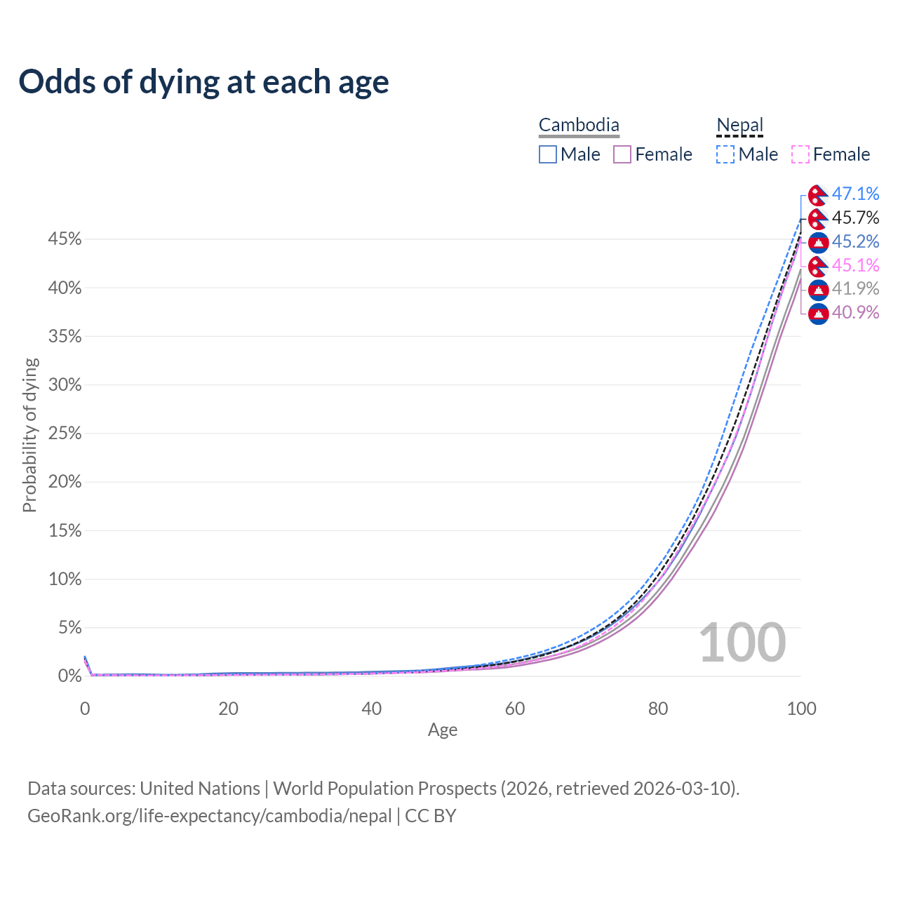 This life expectancy calculator shows the odds of living to 100, 95, 90, and below based on current age for both males and females in Cambodia and Nepal, along with mean and median age of death. The calculations are based on the 2026 life tables (actuarial tables) from the UN World Population Prospects.
