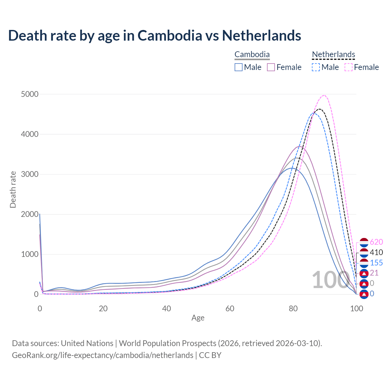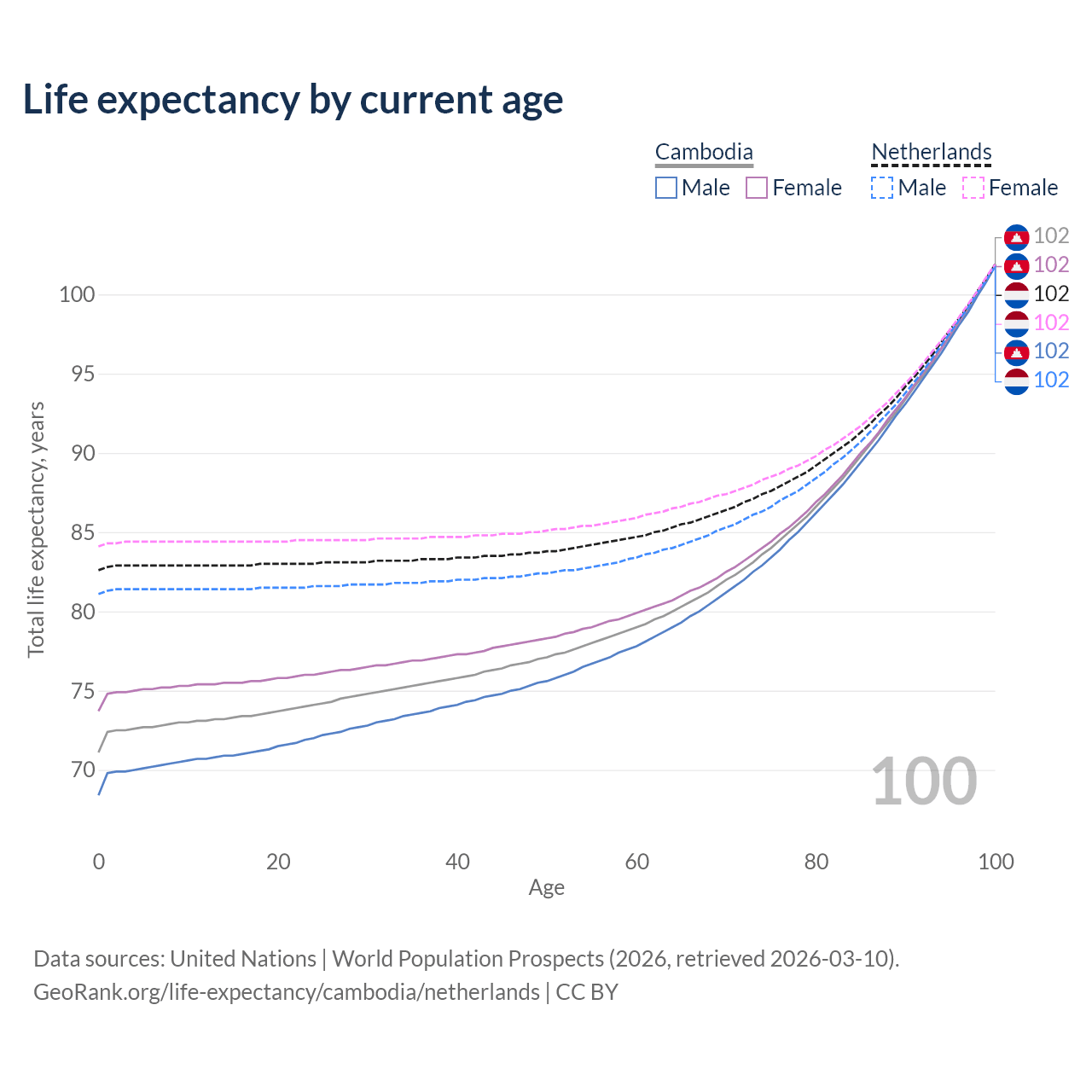 This life expectancy calculator shows the odds of living to 100, 95, 90, and below based on current age for both males and females in Cambodia and the Netherlands, along with mean and median age of death. The calculations are based on the 2026 life tables (actuarial tables) from the UN World Population Prospects.