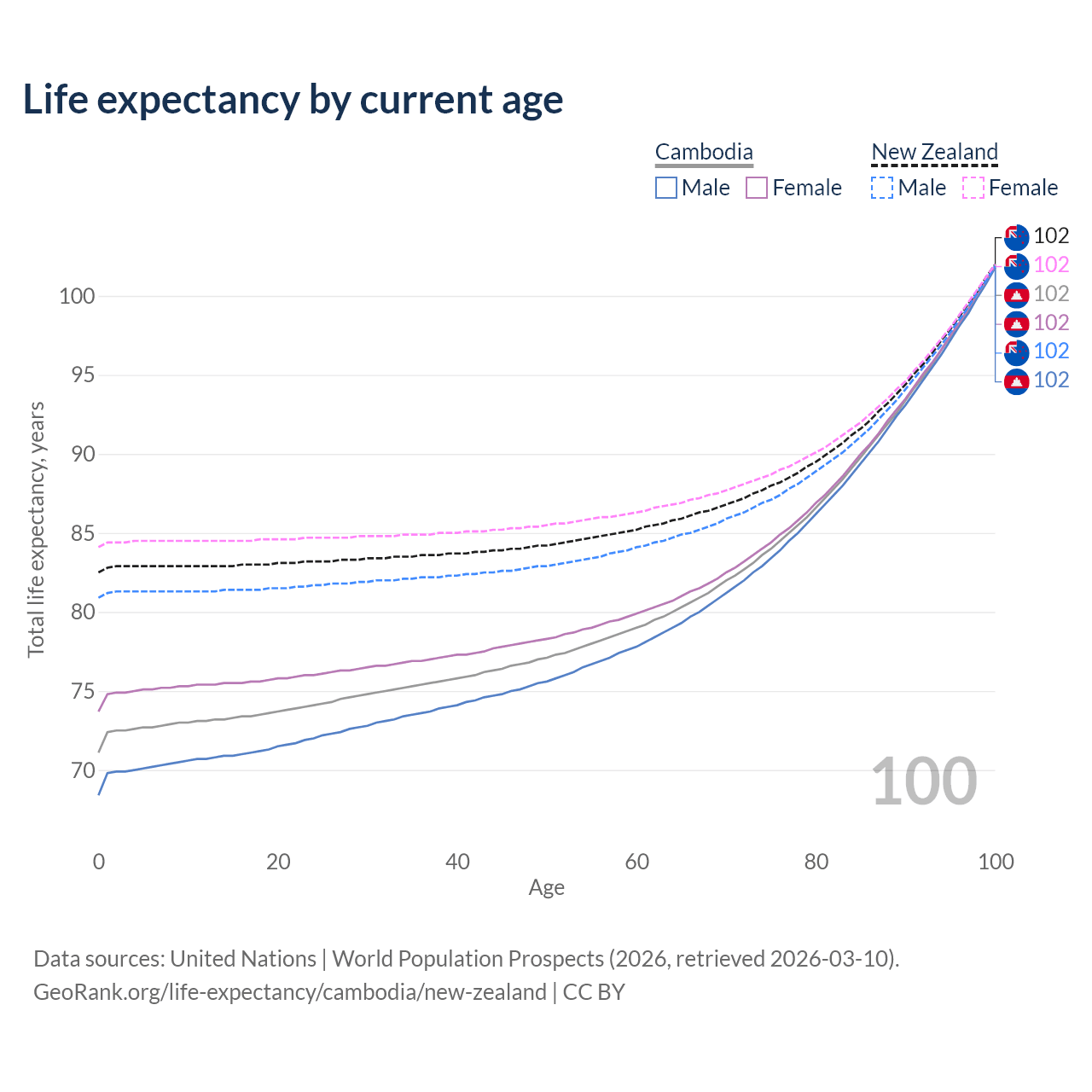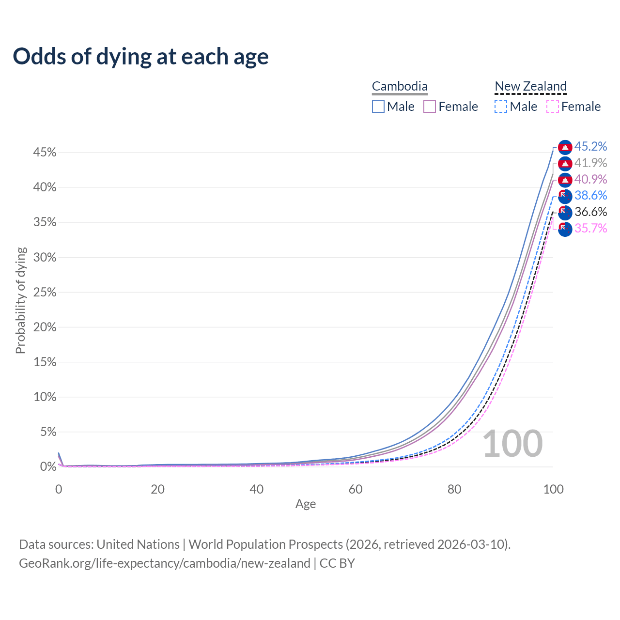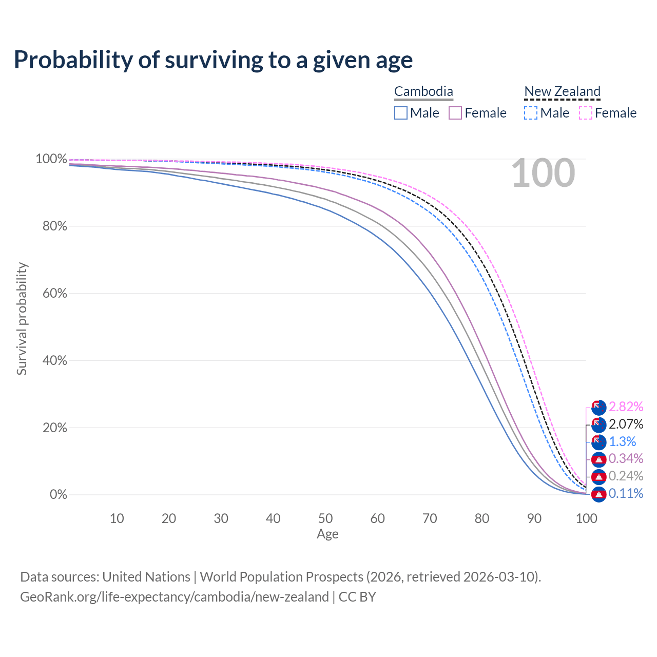 This life expectancy calculator shows the odds of living to 100, 95, 90, and below based on current age for both males and females in Cambodia and New Zealand, along with mean and median age of death. The calculations are based on the 2026 life tables (actuarial tables) from the UN World Population Prospects.