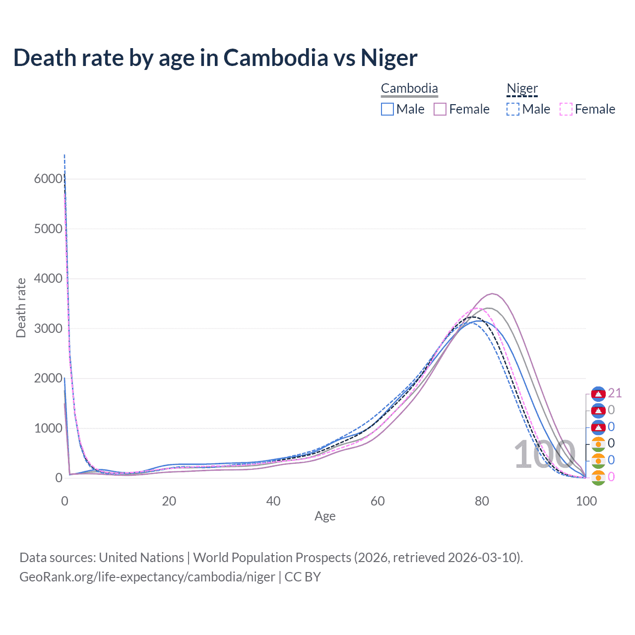 In Cambodia, the most common age of death is 81, compared to 0 in Niger. The median age of death is 76.5 in Cambodia and 71.7 in Niger, meaning only half of each cohort is expected to live past that age.