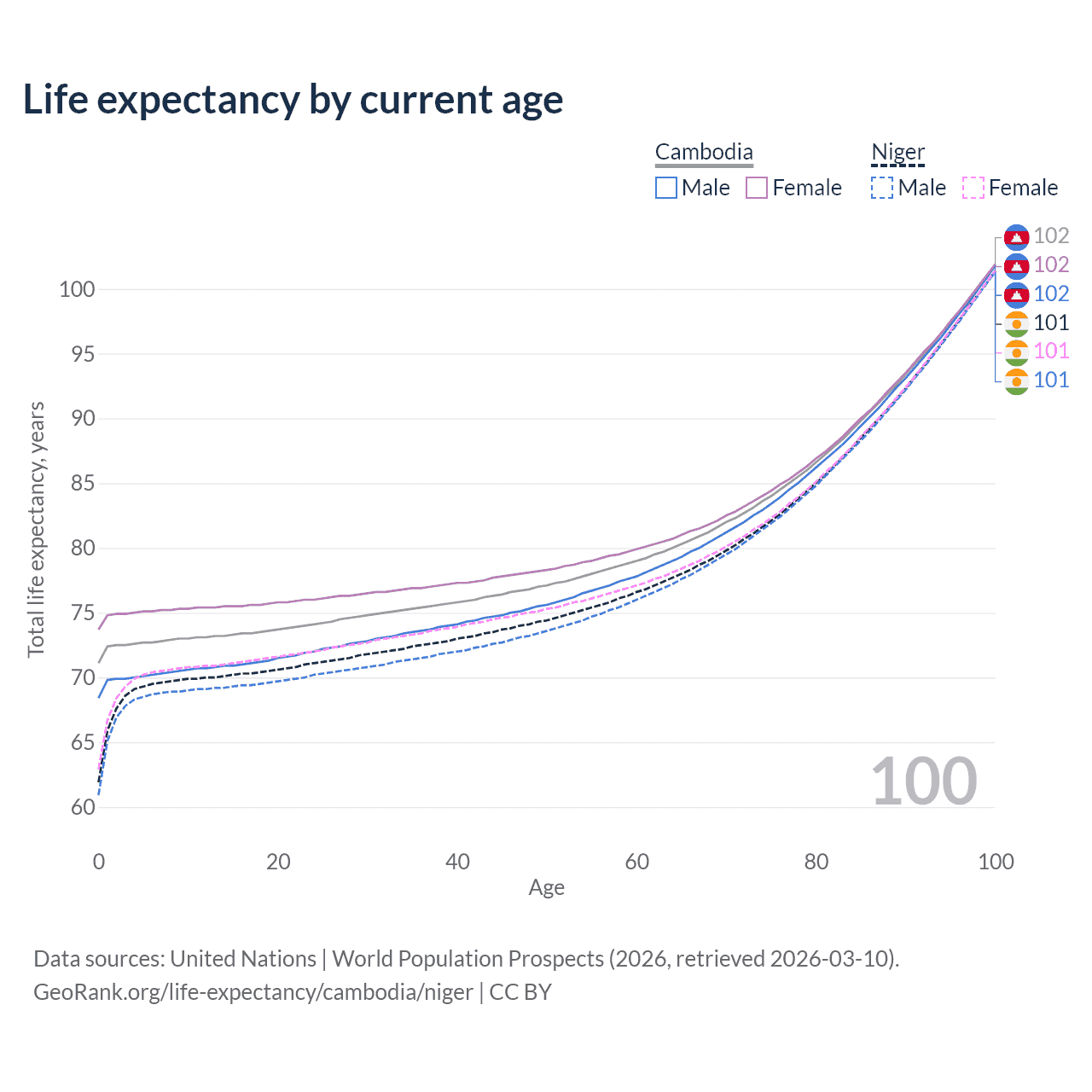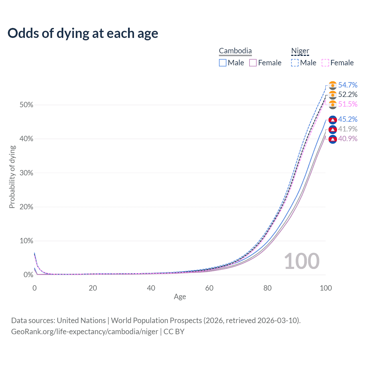 This life expectancy calculator shows the odds of living to 100, 95, 90, and below based on current age for both males and females in Cambodia and Niger, along with mean and median age of death. The calculations are based on the 2026 life tables (actuarial tables) from the UN World Population Prospects.