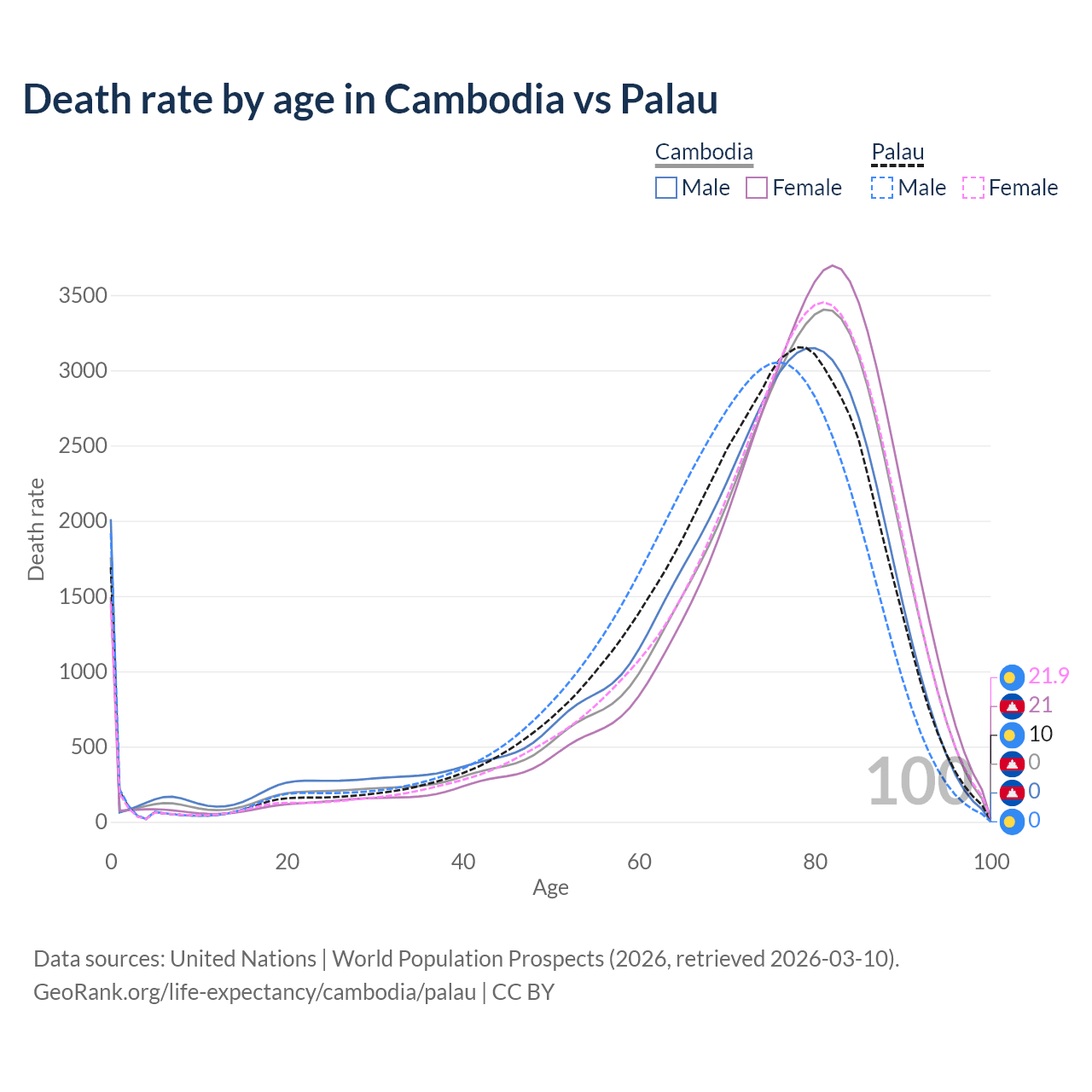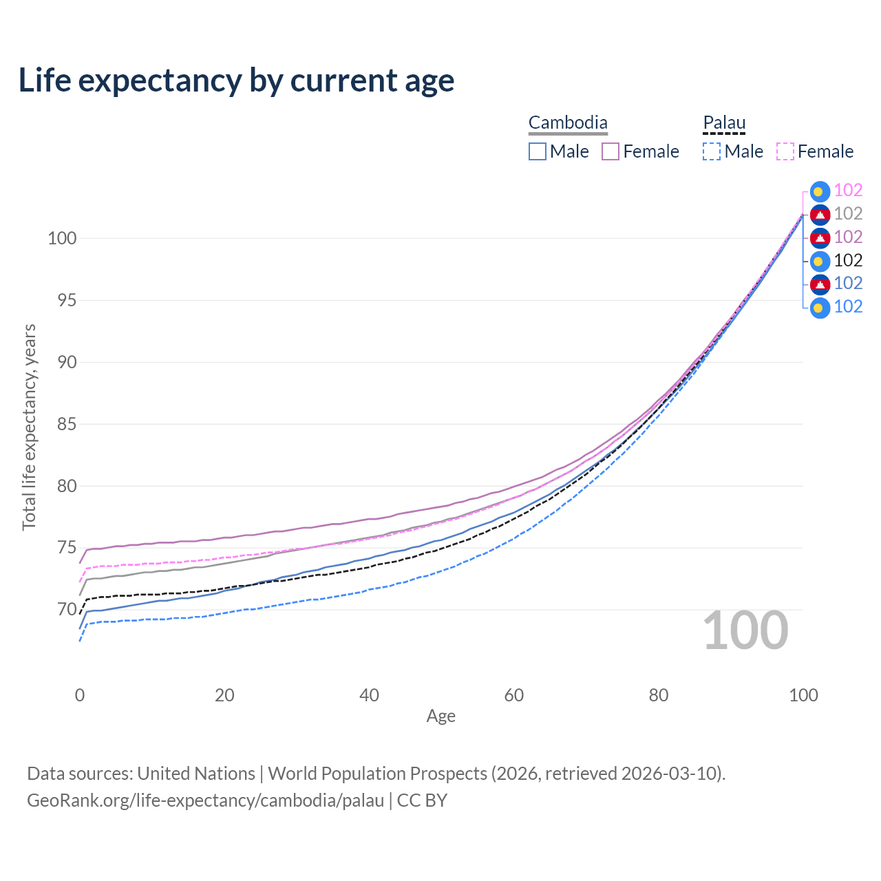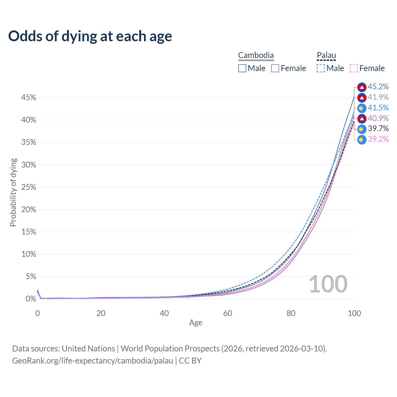 This life expectancy calculator shows the odds of living to 100, 95, 90, and below based on current age for both males and females in Cambodia and Palau, along with mean and median age of death. The calculations are based on the 2026 life tables (actuarial tables) from the UN World Population Prospects.