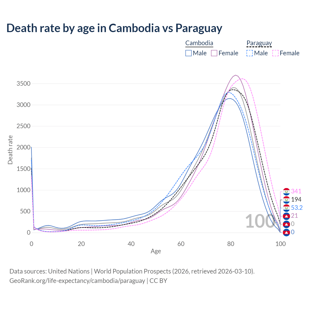 In Cambodia, the most common age of death is 81, compared to 81 in Paraguay. The median age of death is 76.5 in Cambodia and 78.4 in Paraguay, meaning only half of each cohort is expected to live past that age.