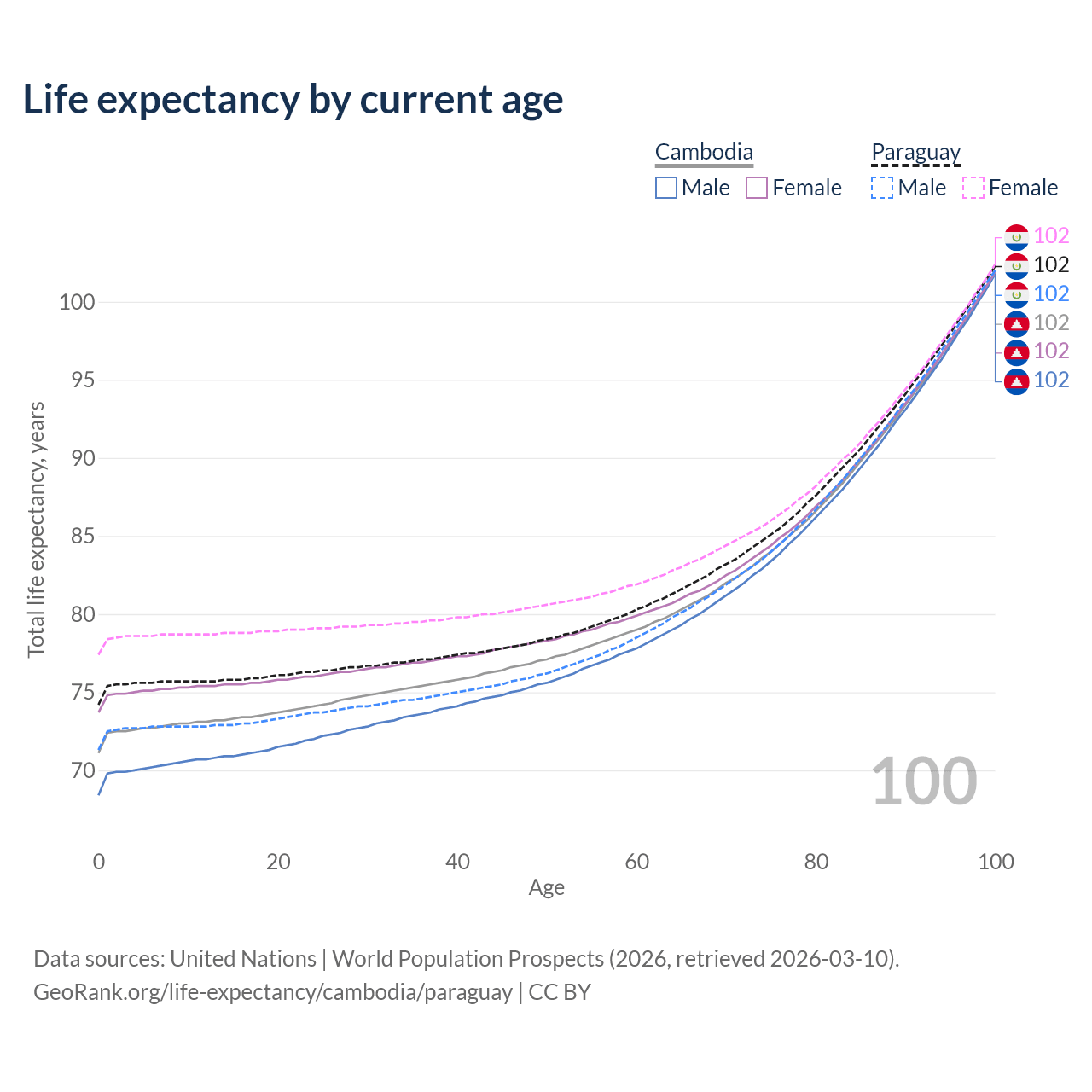 This life expectancy calculator shows the odds of living to 100, 95, 90, and below based on current age for both males and females in Cambodia and Paraguay, along with mean and median age of death. The calculations are based on the 2026 life tables (actuarial tables) from the UN World Population Prospects.