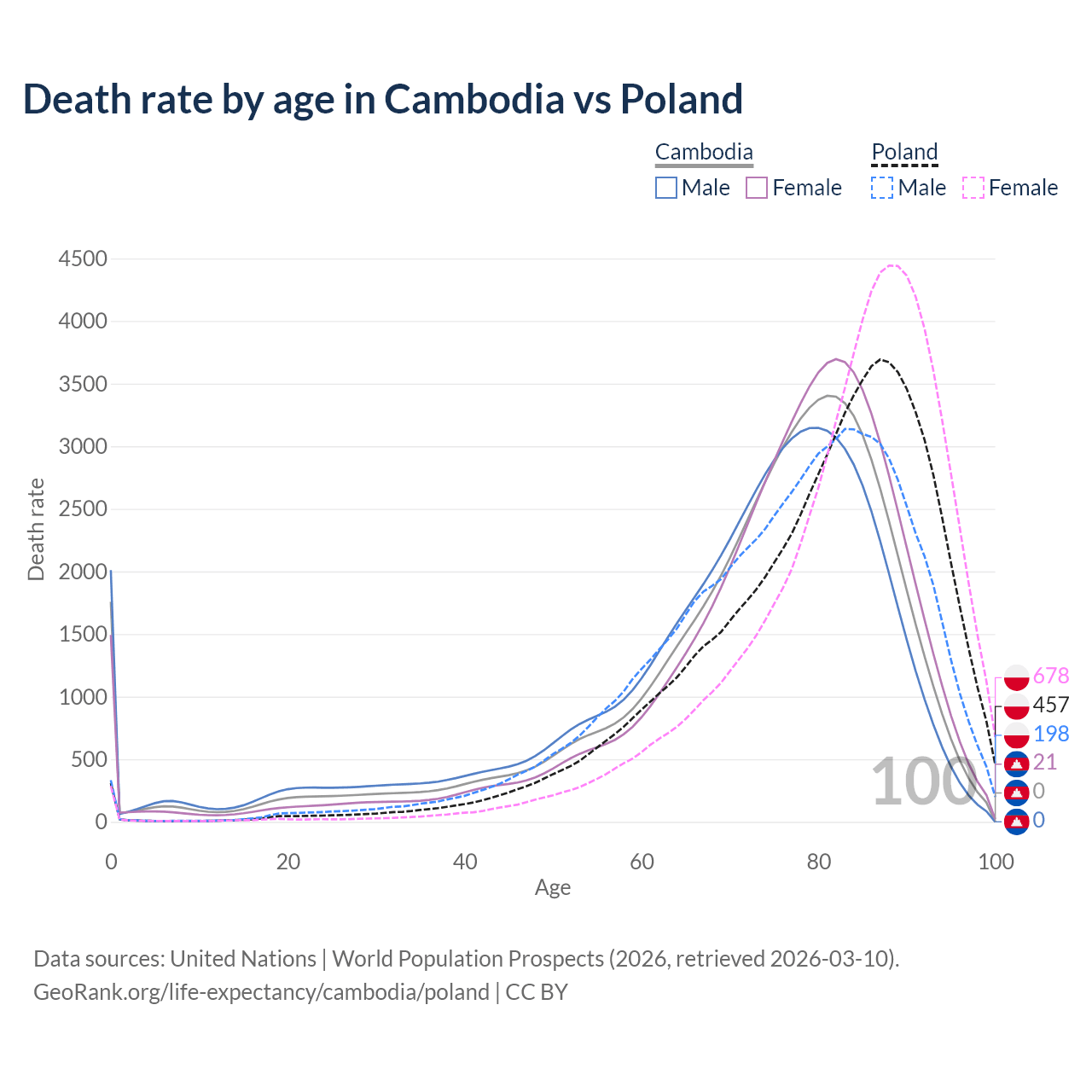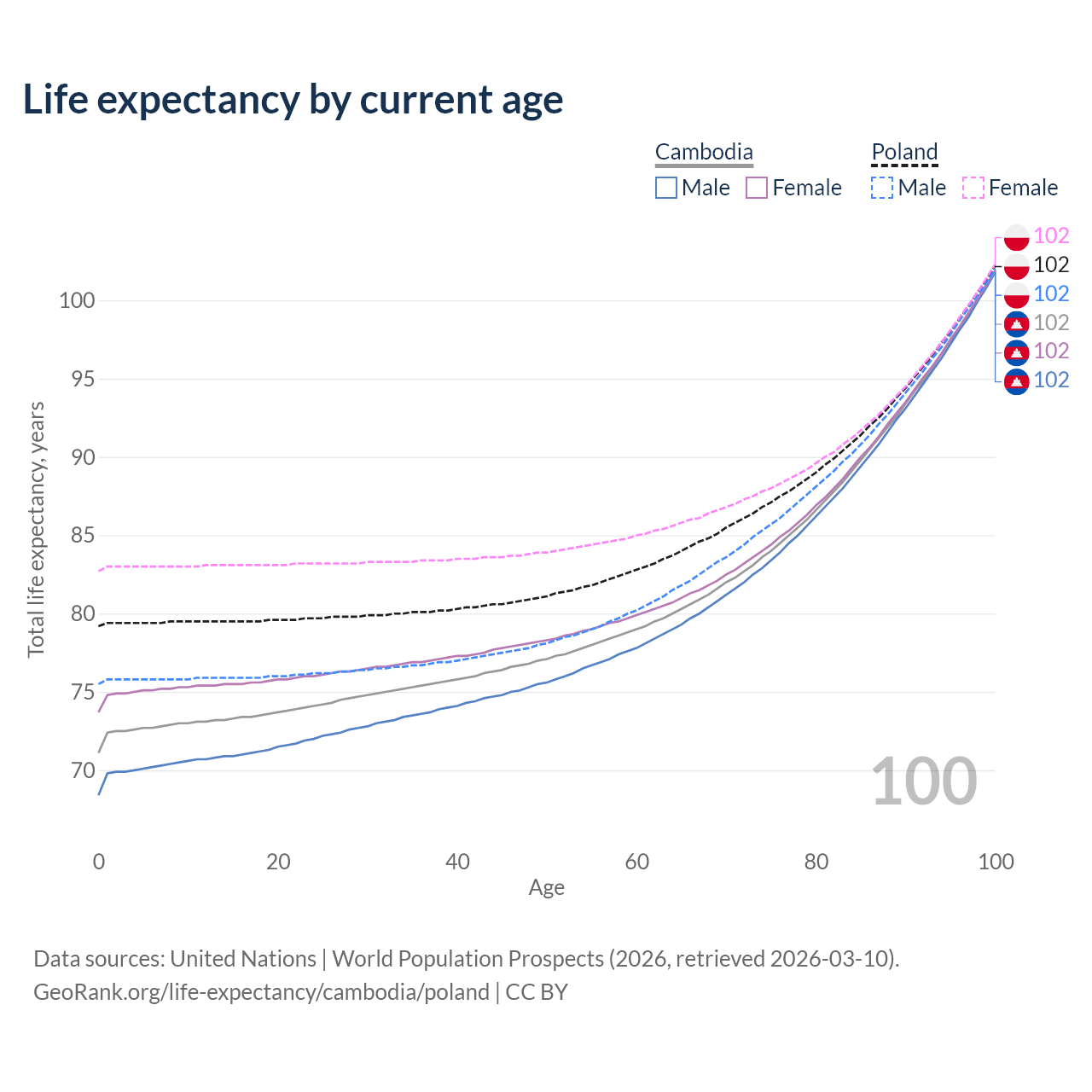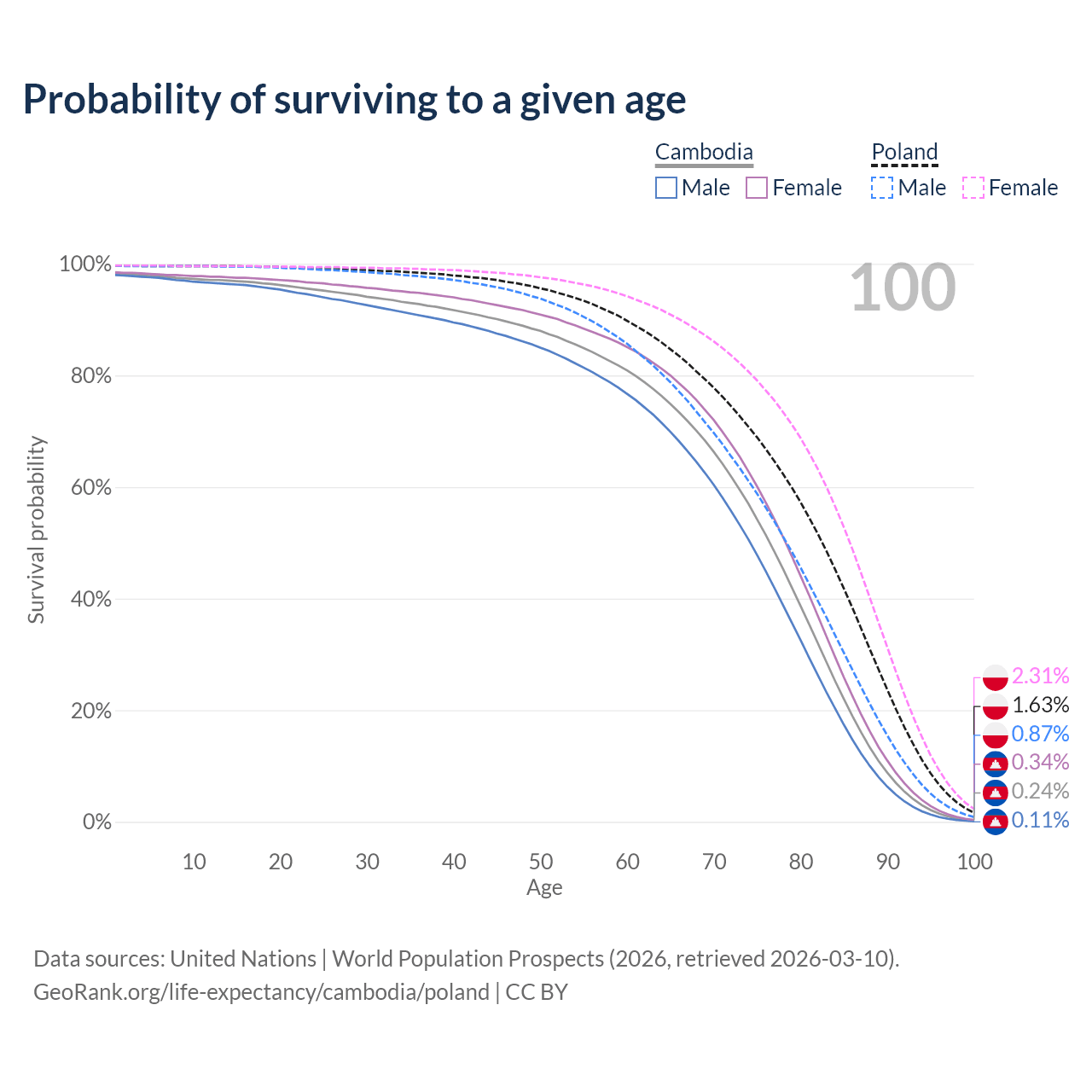 This life expectancy calculator shows the odds of living to 100, 95, 90, and below based on current age for both males and females in Cambodia and Poland, along with mean and median age of death. The calculations are based on the 2026 life tables (actuarial tables) from the UN World Population Prospects.