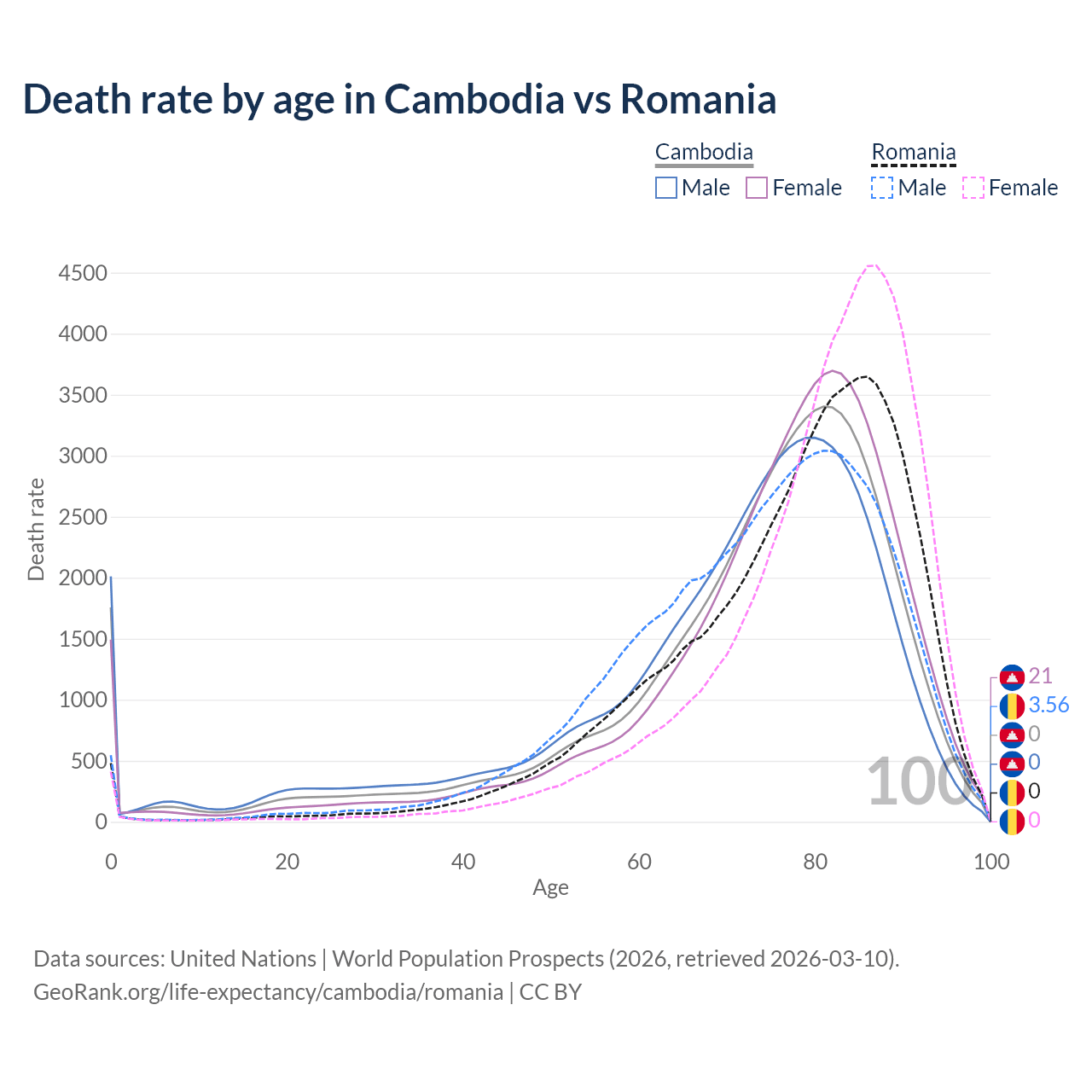This life expectancy calculator shows the odds of living to 100, 95, 90, and below based on current age for both males and females in Cambodia and Romania, along with mean and median age of death. The calculations are based on the 2026 life tables (actuarial tables) from the UN World Population Prospects.