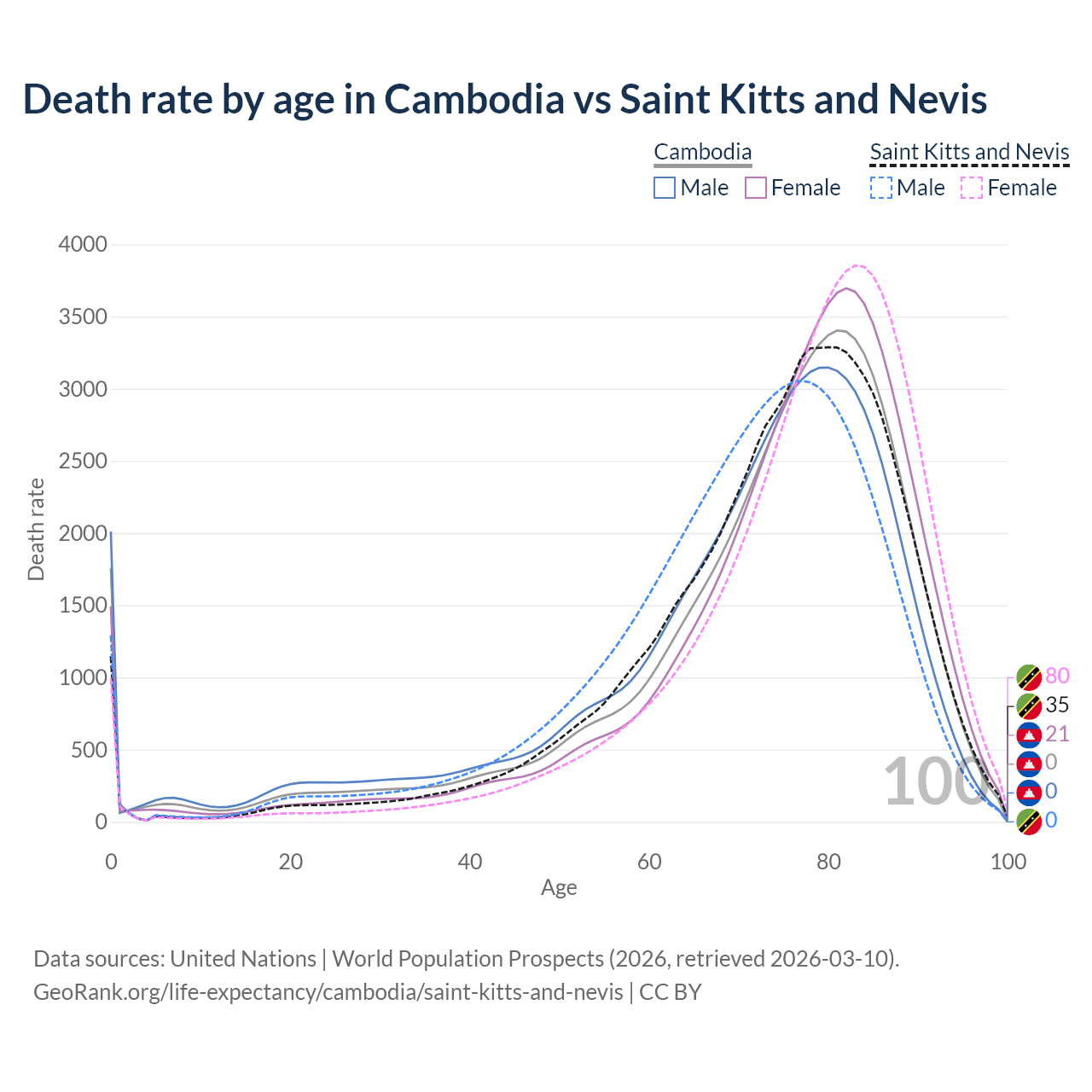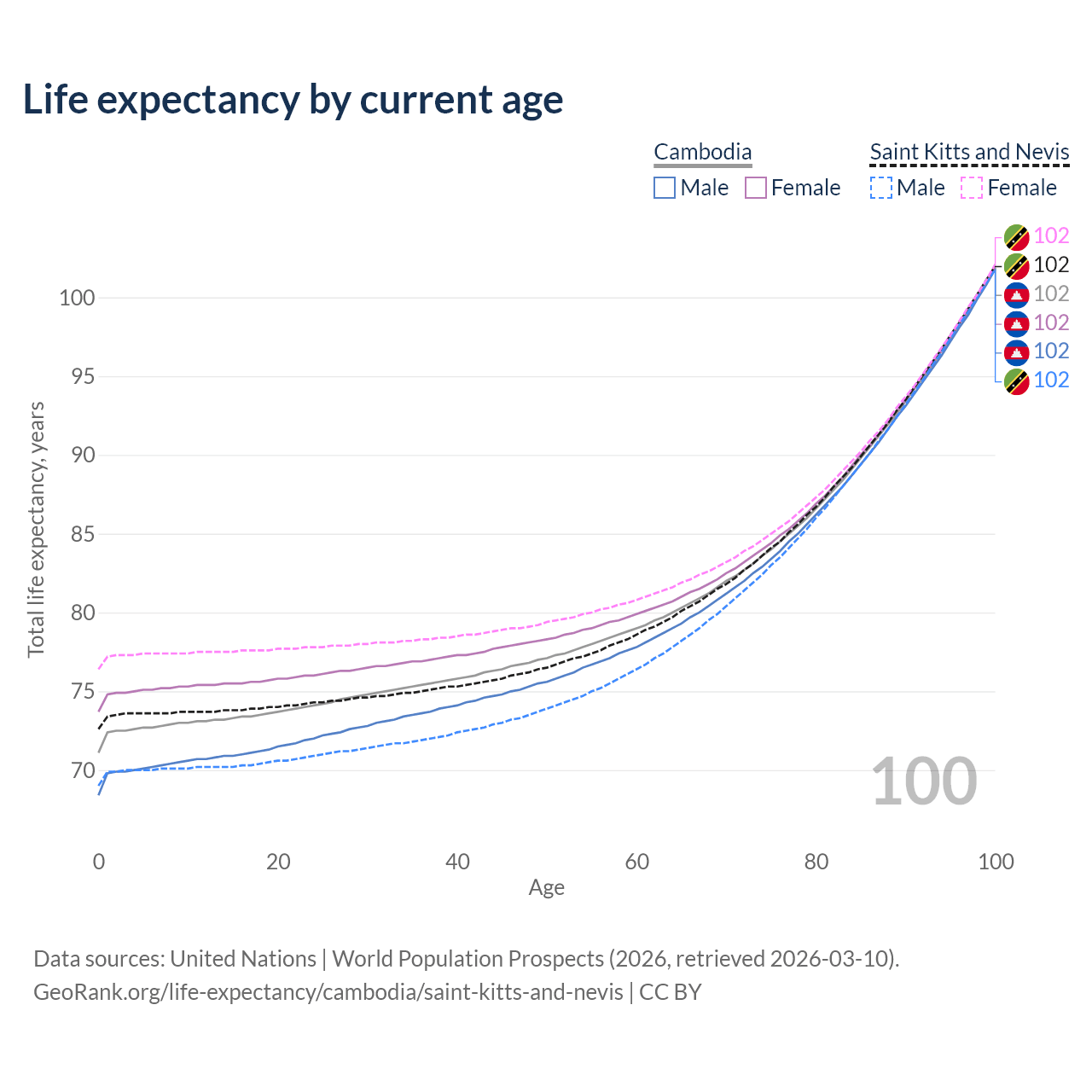 This life expectancy calculator shows the odds of living to 100, 95, 90, and below based on current age for both males and females in Cambodia and Saint Kitts and Nevis, along with mean and median age of death. The calculations are based on the 2026 life tables (actuarial tables) from the UN World Population Prospects.