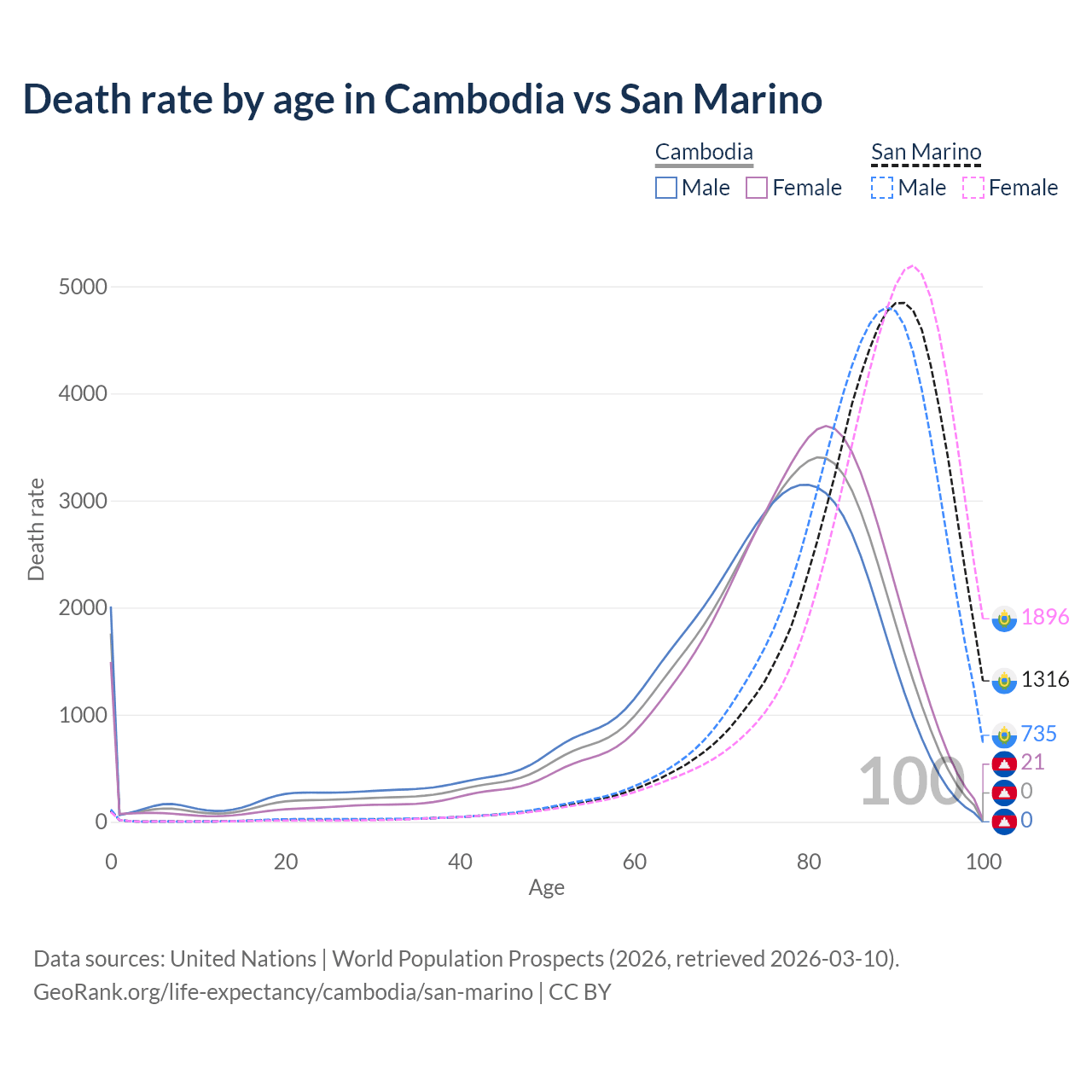 In Cambodia, the most common age of death is 81, compared to 91 in San Marino. The median age of death is 76.5 in Cambodia and 88.3 in San Marino, meaning only half of each cohort is expected to live past that age.