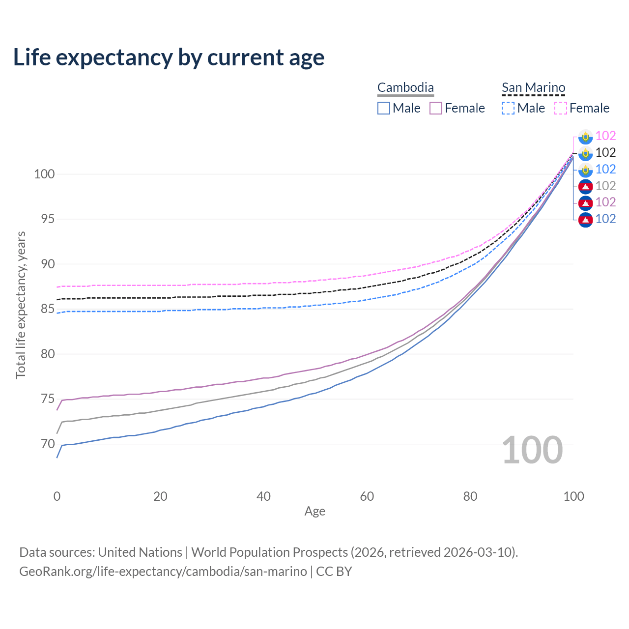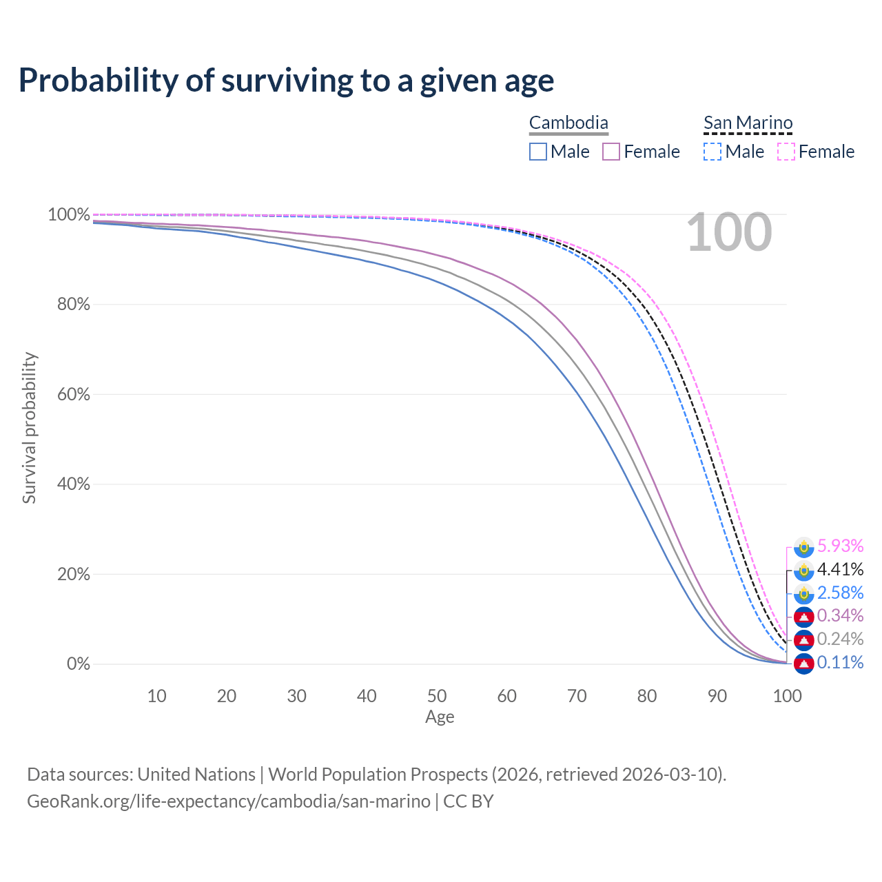 This life expectancy calculator shows the odds of living to 100, 95, 90, and below based on current age for both males and females in Cambodia and San Marino, along with mean and median age of death. The calculations are based on the 2026 life tables (actuarial tables) from the UN World Population Prospects.