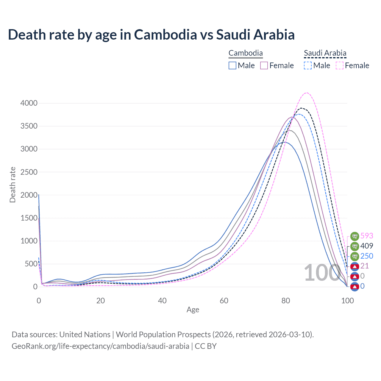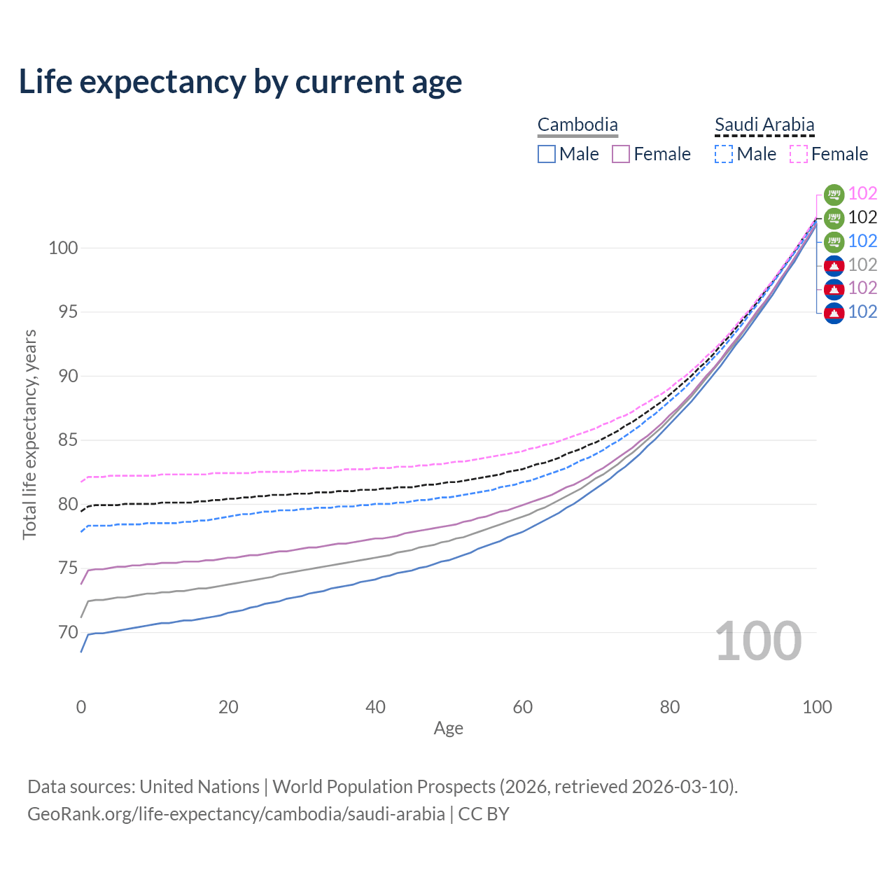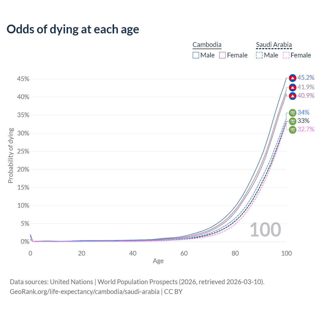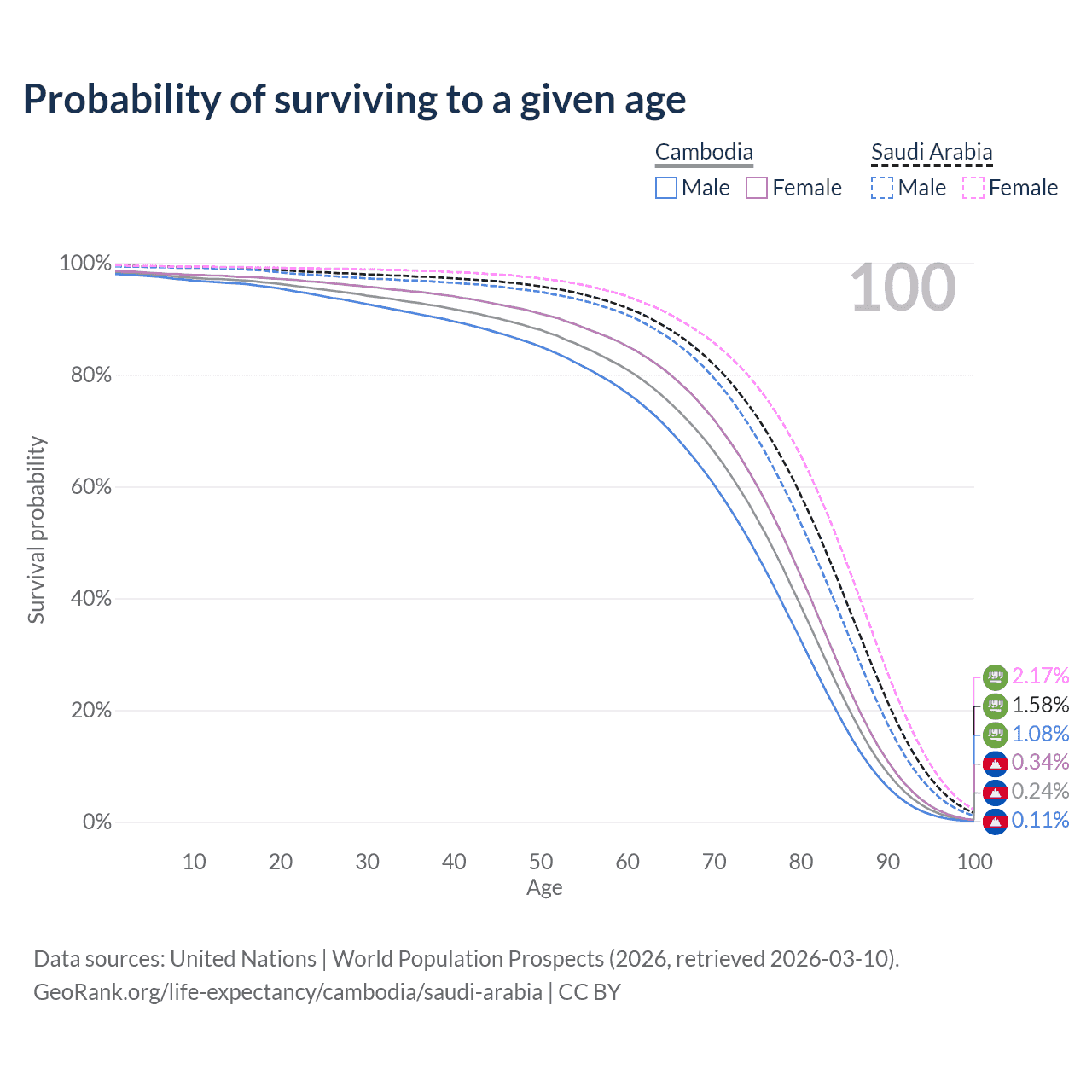 This life expectancy calculator shows the odds of living to 100, 95, 90, and below based on current age for both males and females in Cambodia and Saudi Arabia, along with mean and median age of death. The calculations are based on the 2026 life tables (actuarial tables) from the UN World Population Prospects.