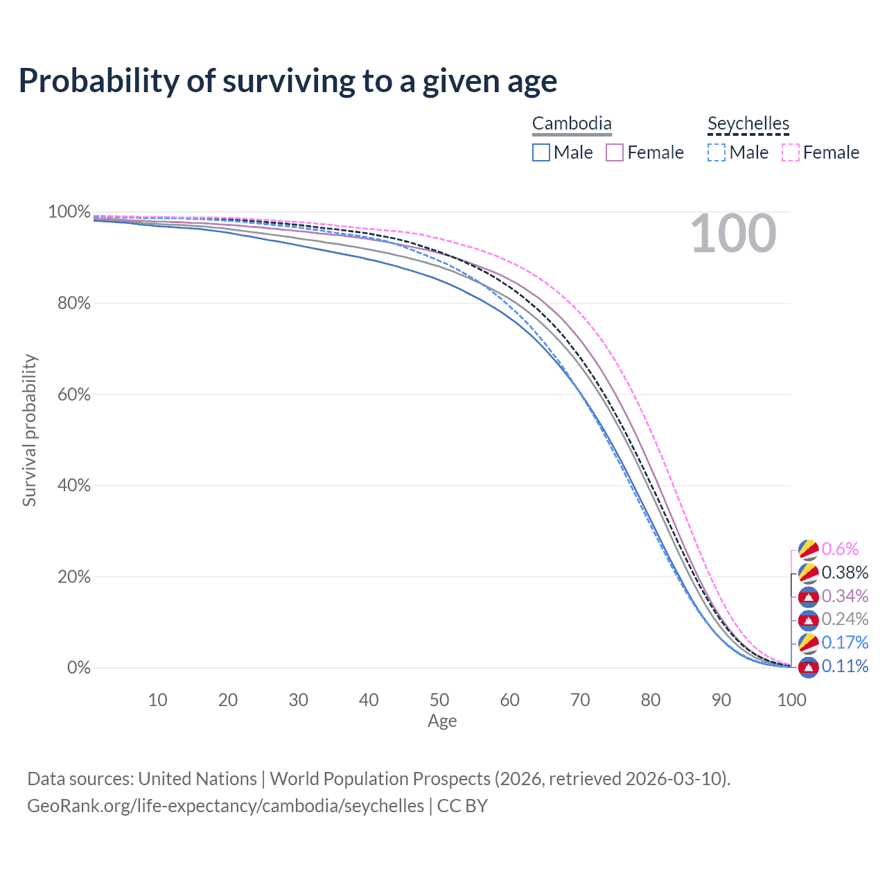 This life expectancy calculator shows the odds of living to 100, 95, 90, and below based on current age for both males and females in Cambodia and the Seychelles, along with mean and median age of death. The calculations are based on the 2026 life tables (actuarial tables) from the UN World Population Prospects.