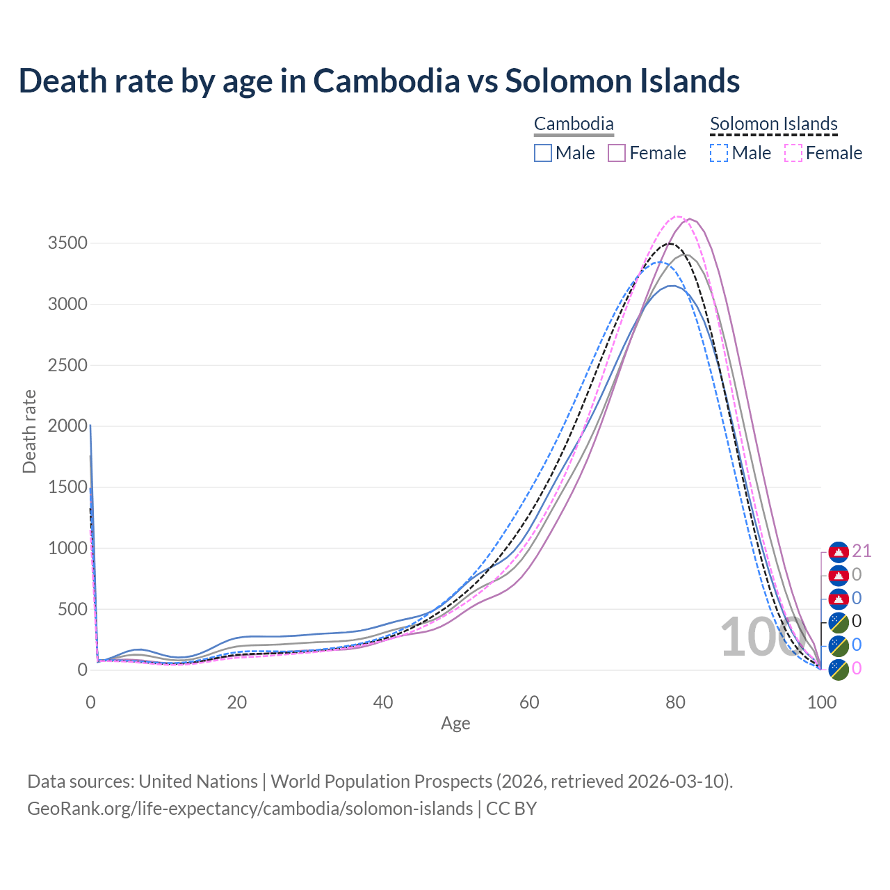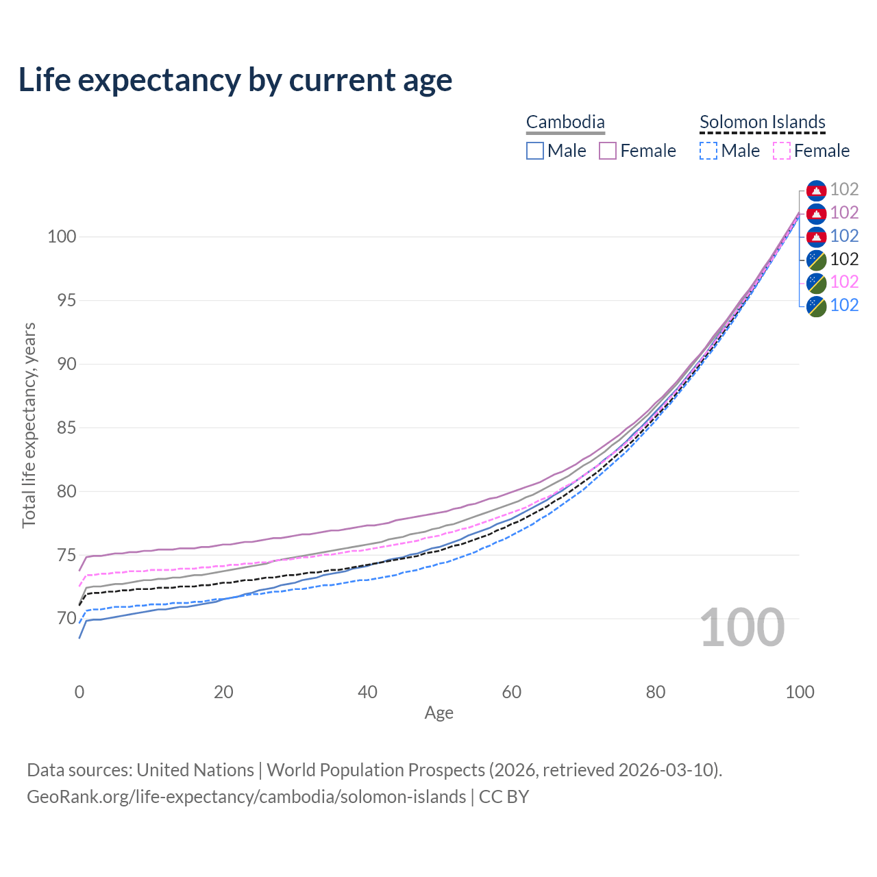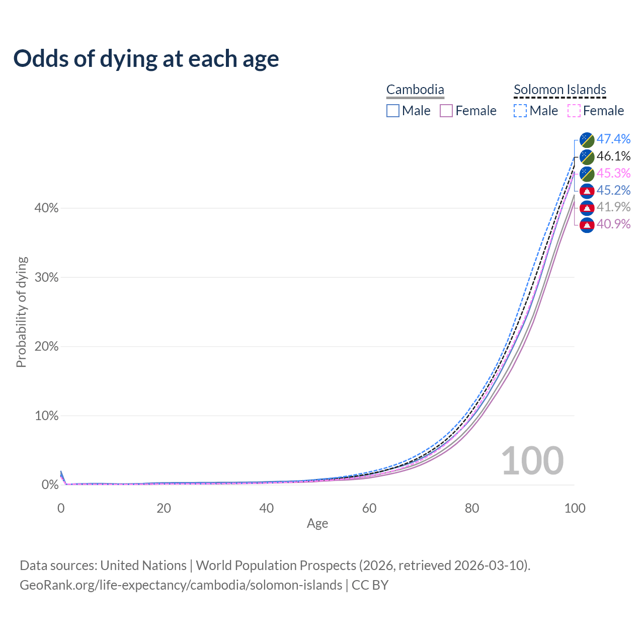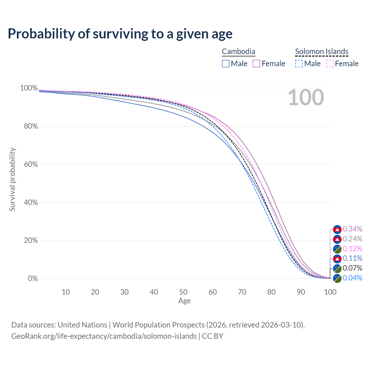 This life expectancy calculator shows the odds of living to 100, 95, 90, and below based on current age for both males and females in Cambodia and the Solomon Islands, along with mean and median age of death. The calculations are based on the 2026 life tables (actuarial tables) from the UN World Population Prospects.