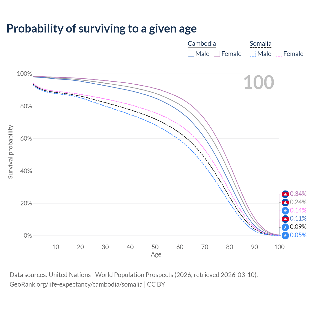 This life expectancy calculator shows the odds of living to 100, 95, 90, and below based on current age for both males and females in Cambodia and Somalia, along with mean and median age of death. The calculations are based on the 2026 life tables (actuarial tables) from the UN World Population Prospects.