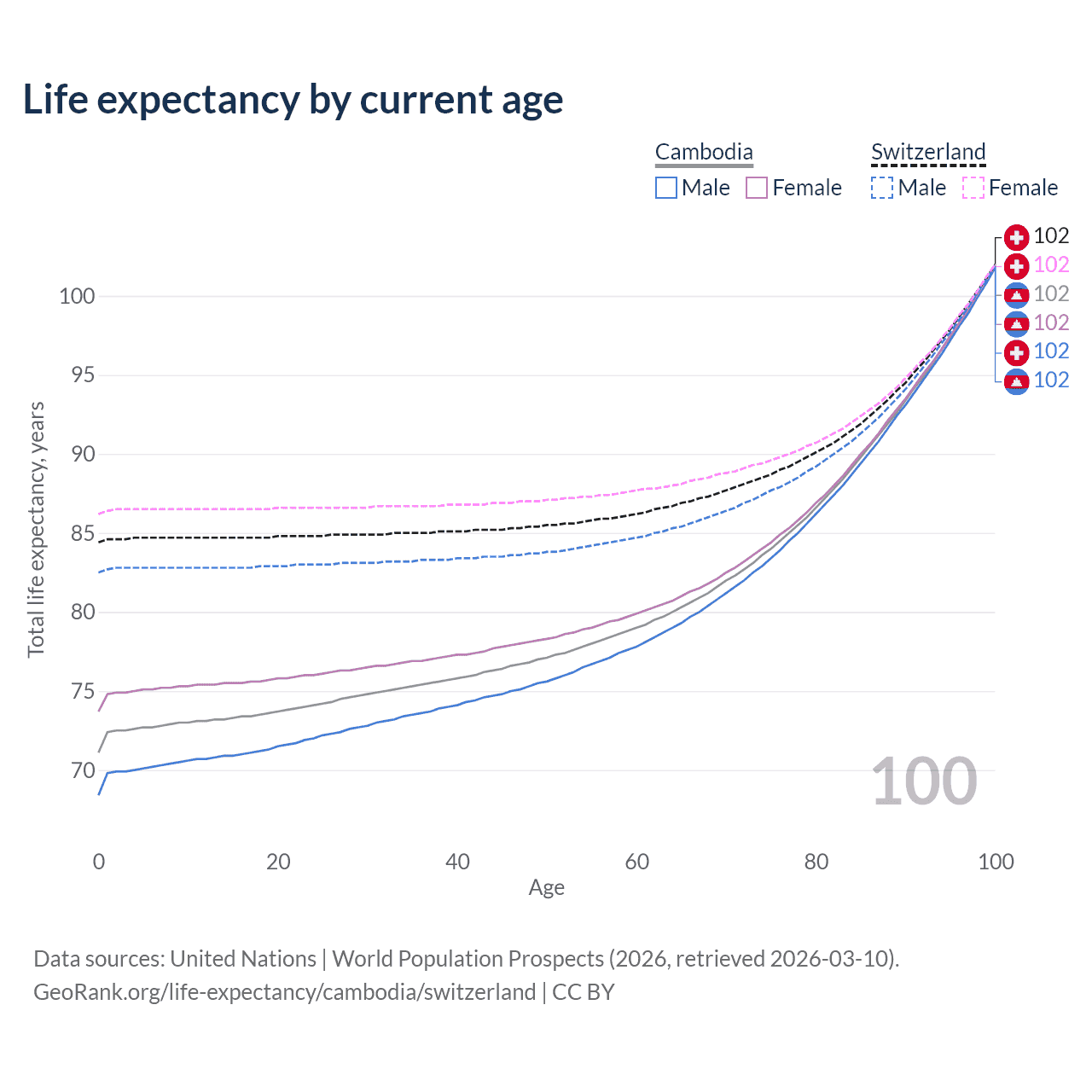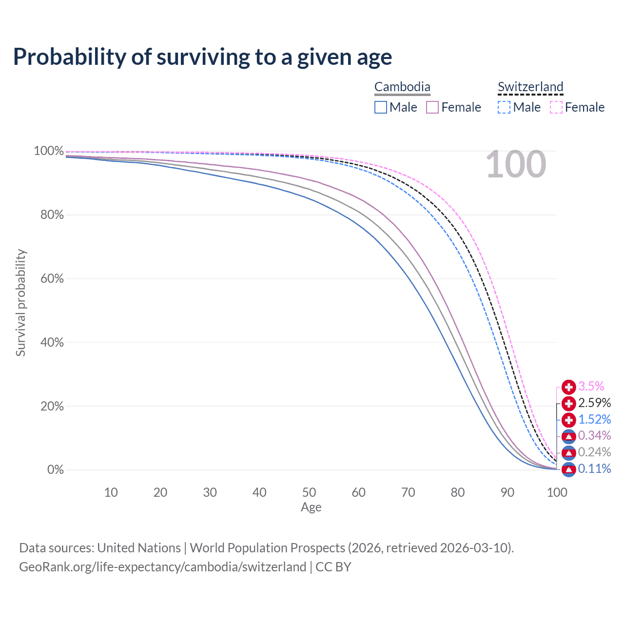This life expectancy calculator shows the odds of living to 100, 95, 90, and below based on current age for both males and females in Cambodia and Switzerland, along with mean and median age of death. The calculations are based on the 2026 life tables (actuarial tables) from the UN World Population Prospects.