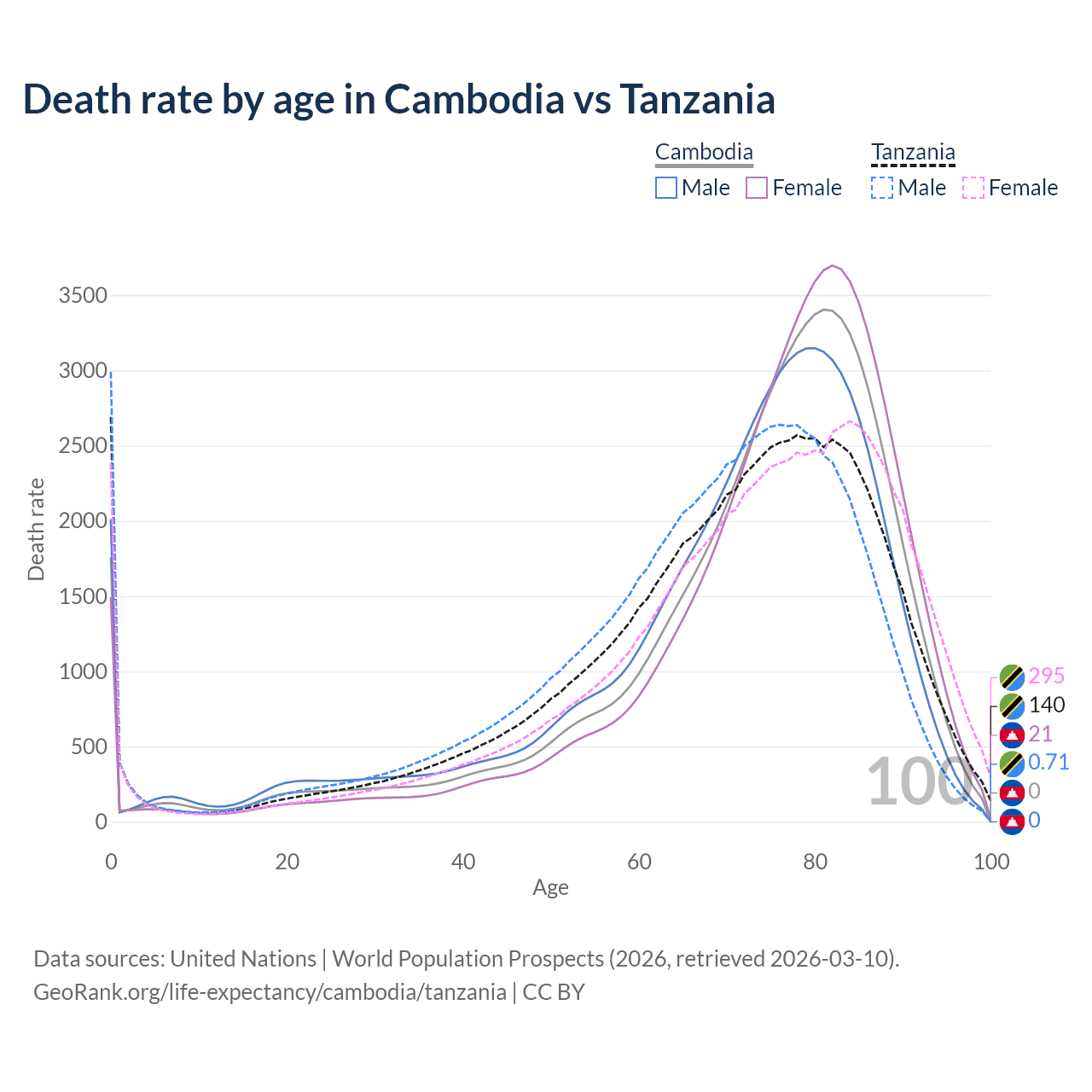 In Cambodia, the most common age of death is 81, compared to 0 in Tanzania. The median age of death is 76.5 in Cambodia and 72.6 in Tanzania, meaning only half of each cohort is expected to live past that age.