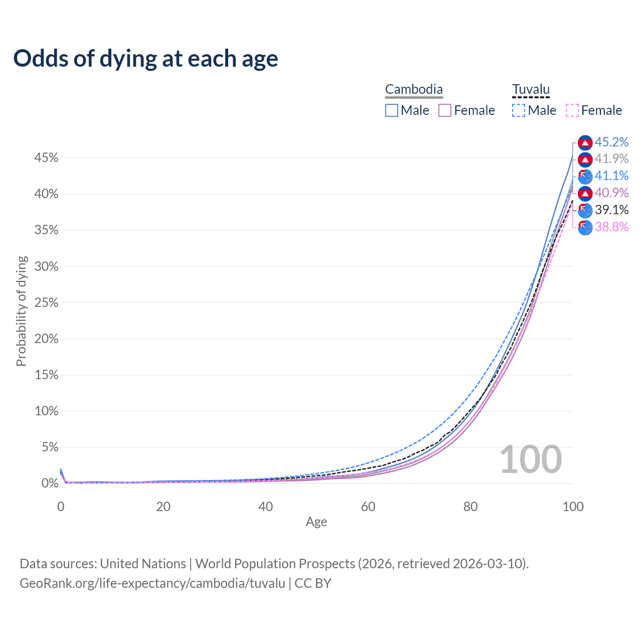 This life expectancy calculator shows the odds of living to 100, 95, 90, and below based on current age for both males and females in Cambodia and Tuvalu, along with mean and median age of death. The calculations are based on the 2026 life tables (actuarial tables) from the UN World Population Prospects.