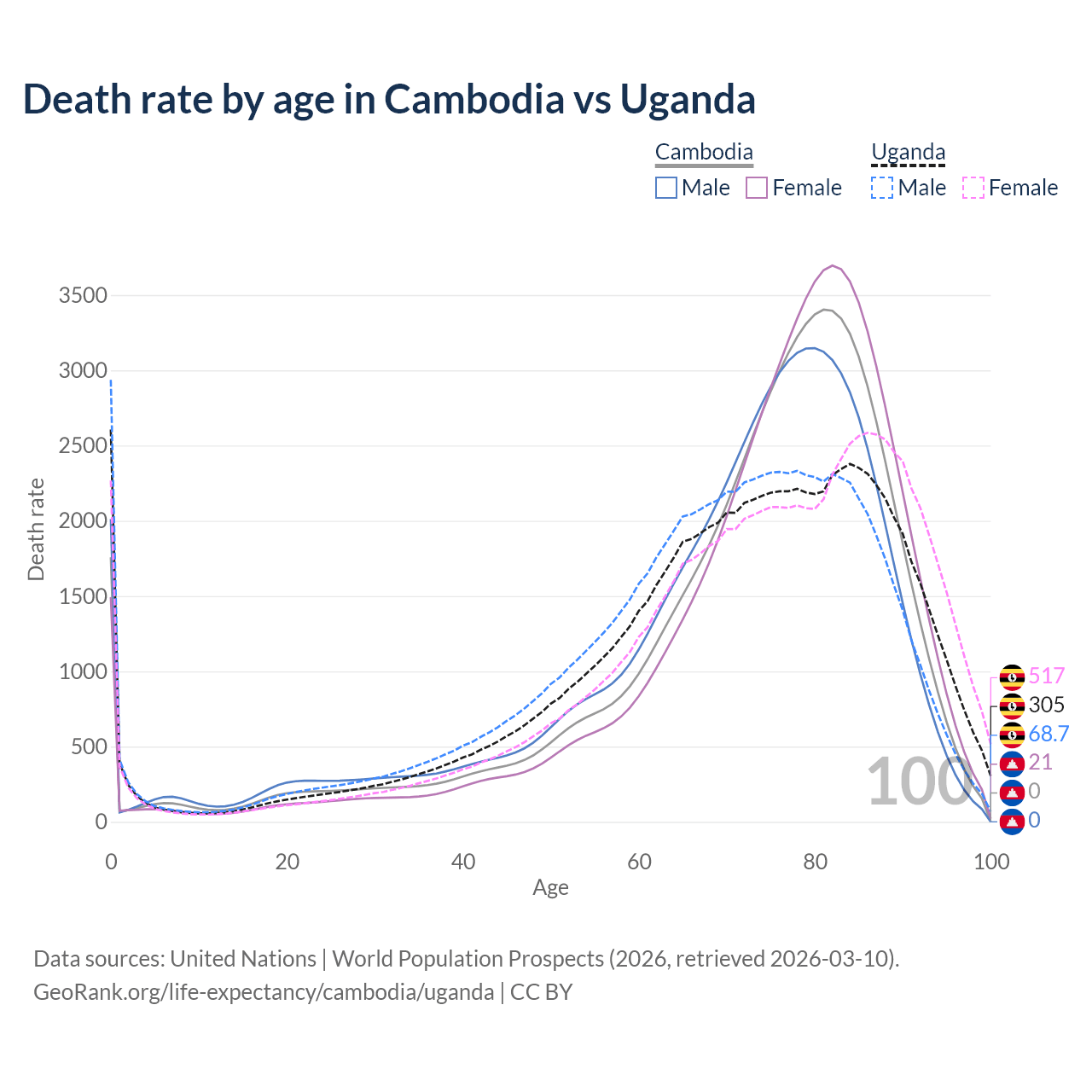 In Cambodia, the most common age of death is 81, compared to 0 in Uganda. The median age of death is 76.5 in Cambodia and 73.3 in Uganda, meaning only half of each cohort is expected to live past that age.