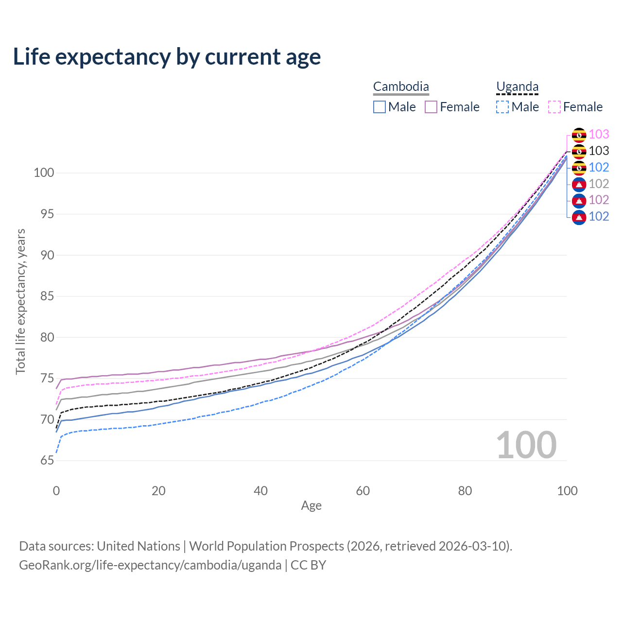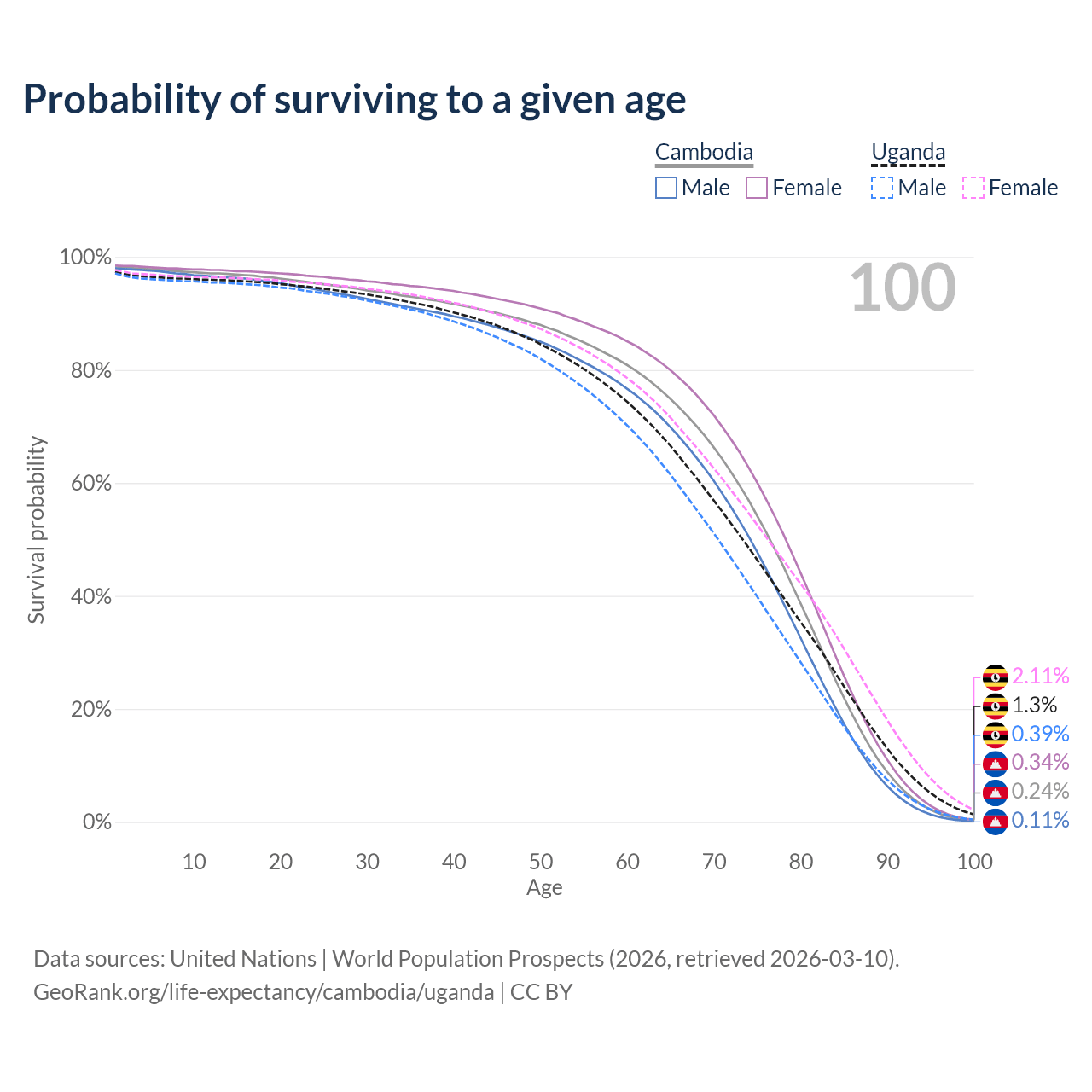 This life expectancy calculator shows the odds of living to 100, 95, 90, and below based on current age for both males and females in Cambodia and Uganda, along with mean and median age of death. The calculations are based on the 2026 life tables (actuarial tables) from the UN World Population Prospects.