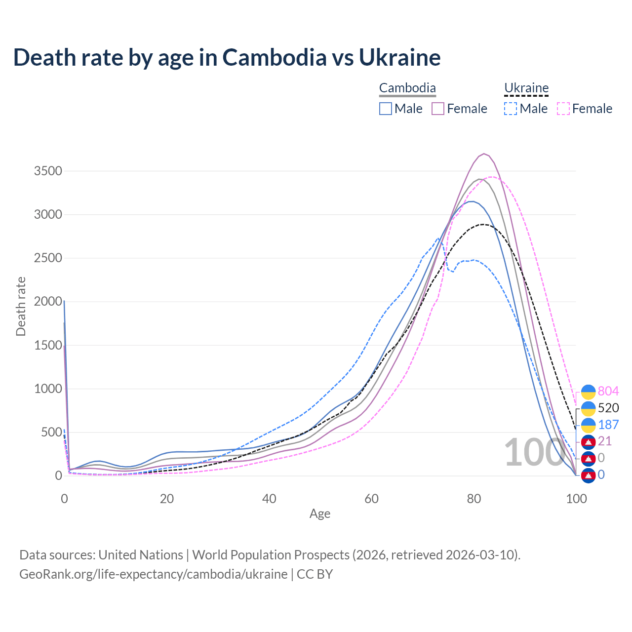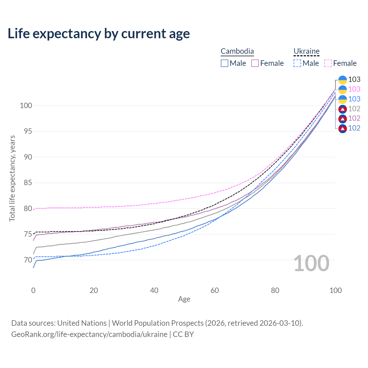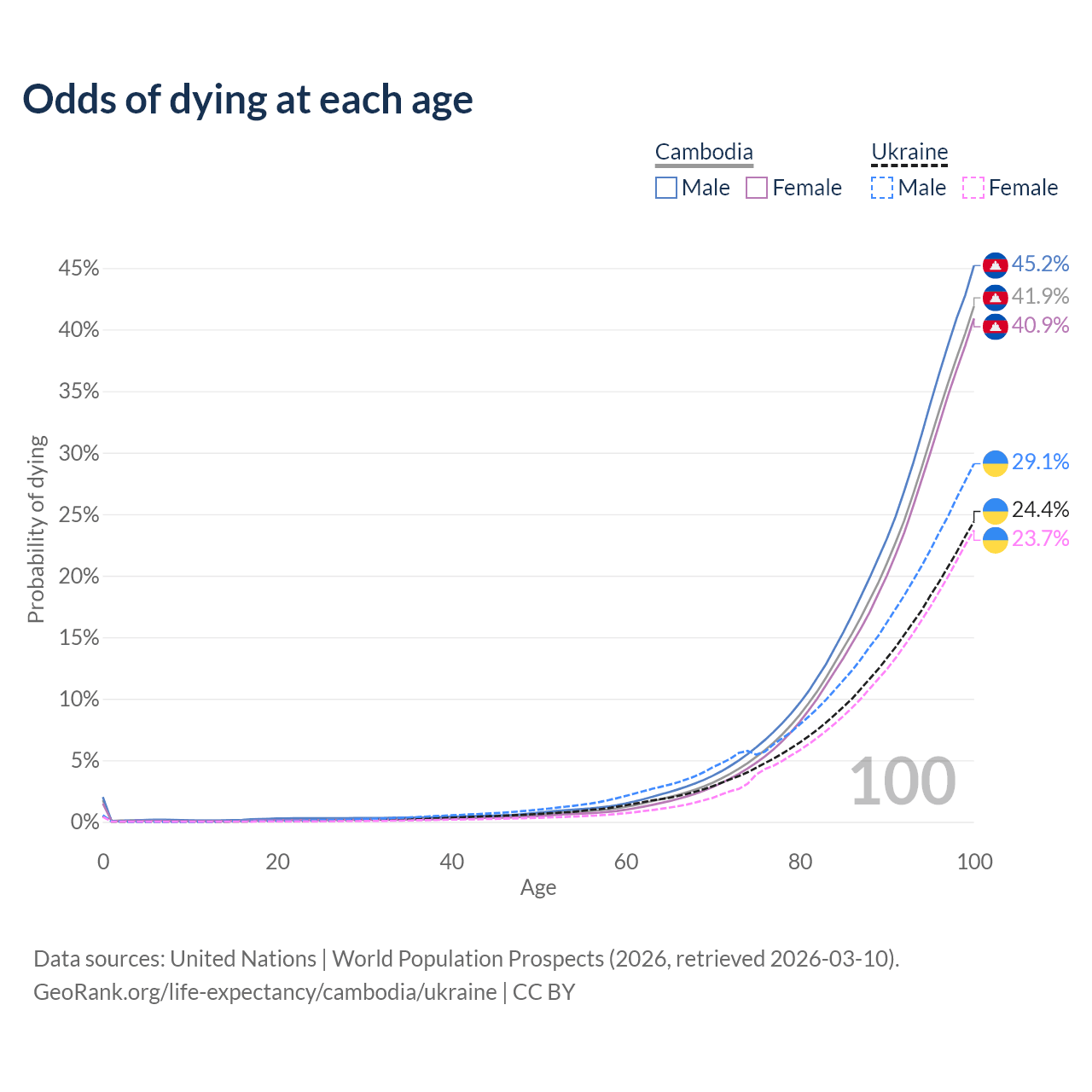 This life expectancy calculator shows the odds of living to 100, 95, 90, and below based on current age for both males and females in Cambodia and Ukraine, along with mean and median age of death. The calculations are based on the 2026 life tables (actuarial tables) from the UN World Population Prospects.