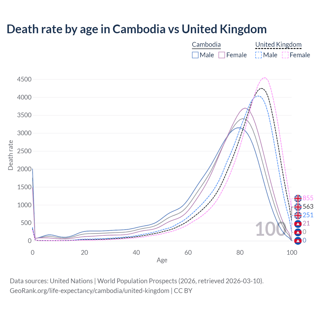 In Cambodia, the most common age of death is 81, compared to 88 in the United Kingdom. The median age of death is 76.5 in Cambodia and 84.9 in the United Kingdom, meaning only half of each cohort is expected to live past that age.