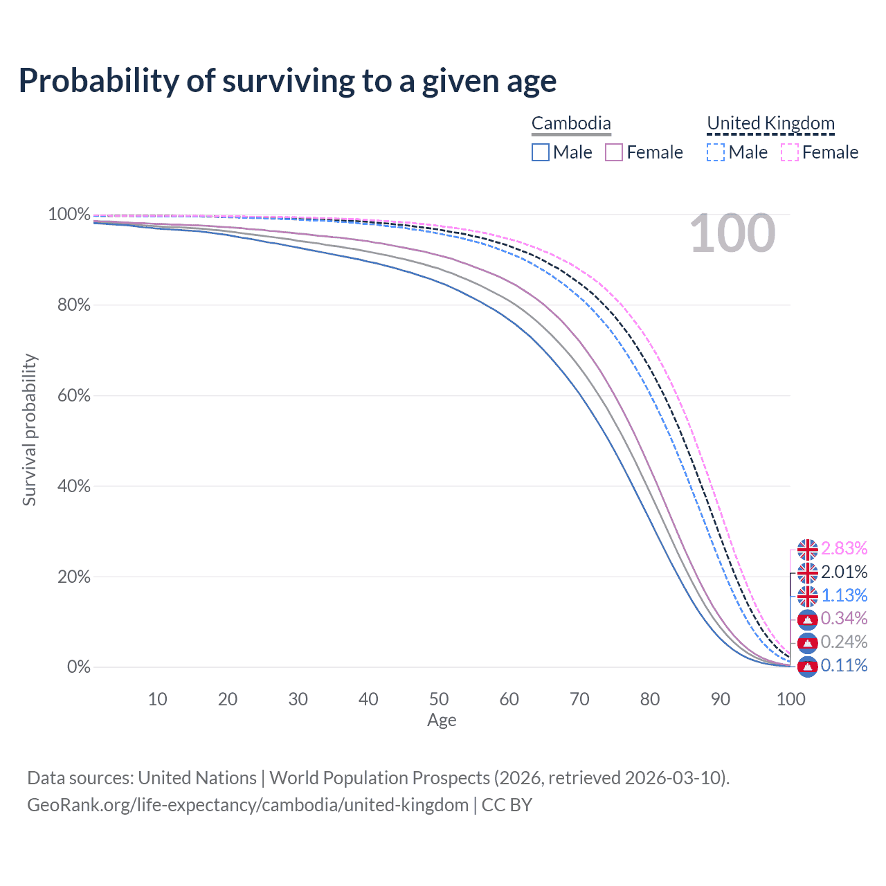 This life expectancy calculator shows the odds of living to 100, 95, 90, and below based on current age for both males and females in Cambodia and the United Kingdom, along with mean and median age of death. The calculations are based on the 2026 life tables (actuarial tables) from the UN World Population Prospects.