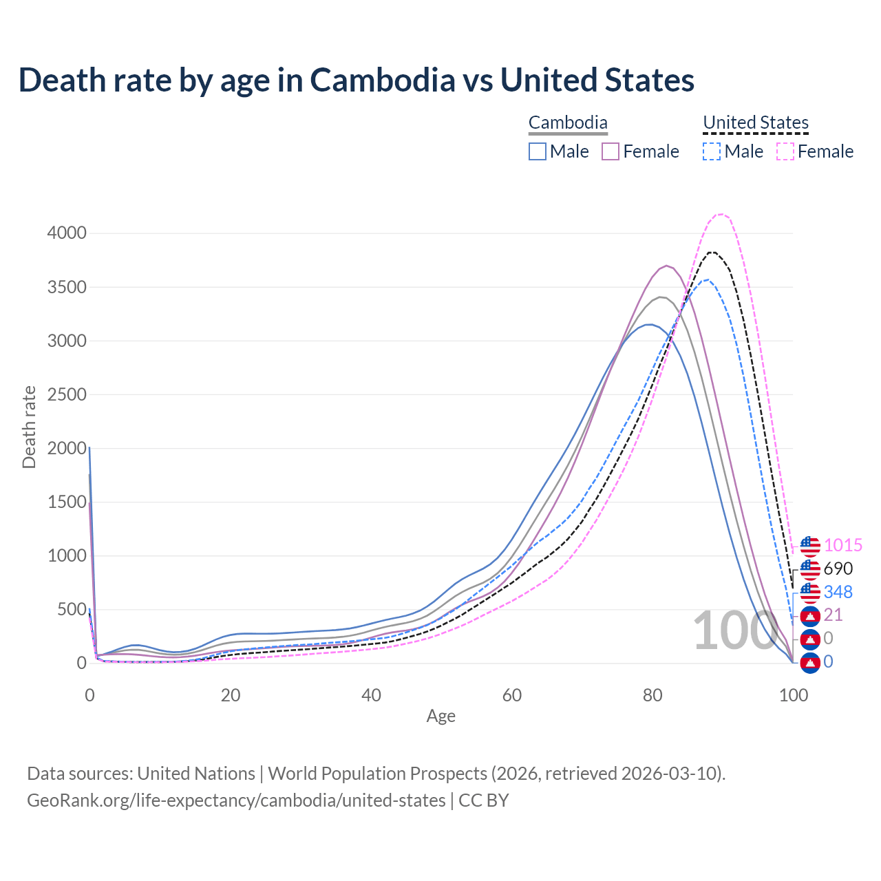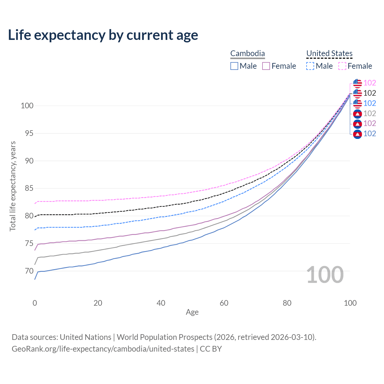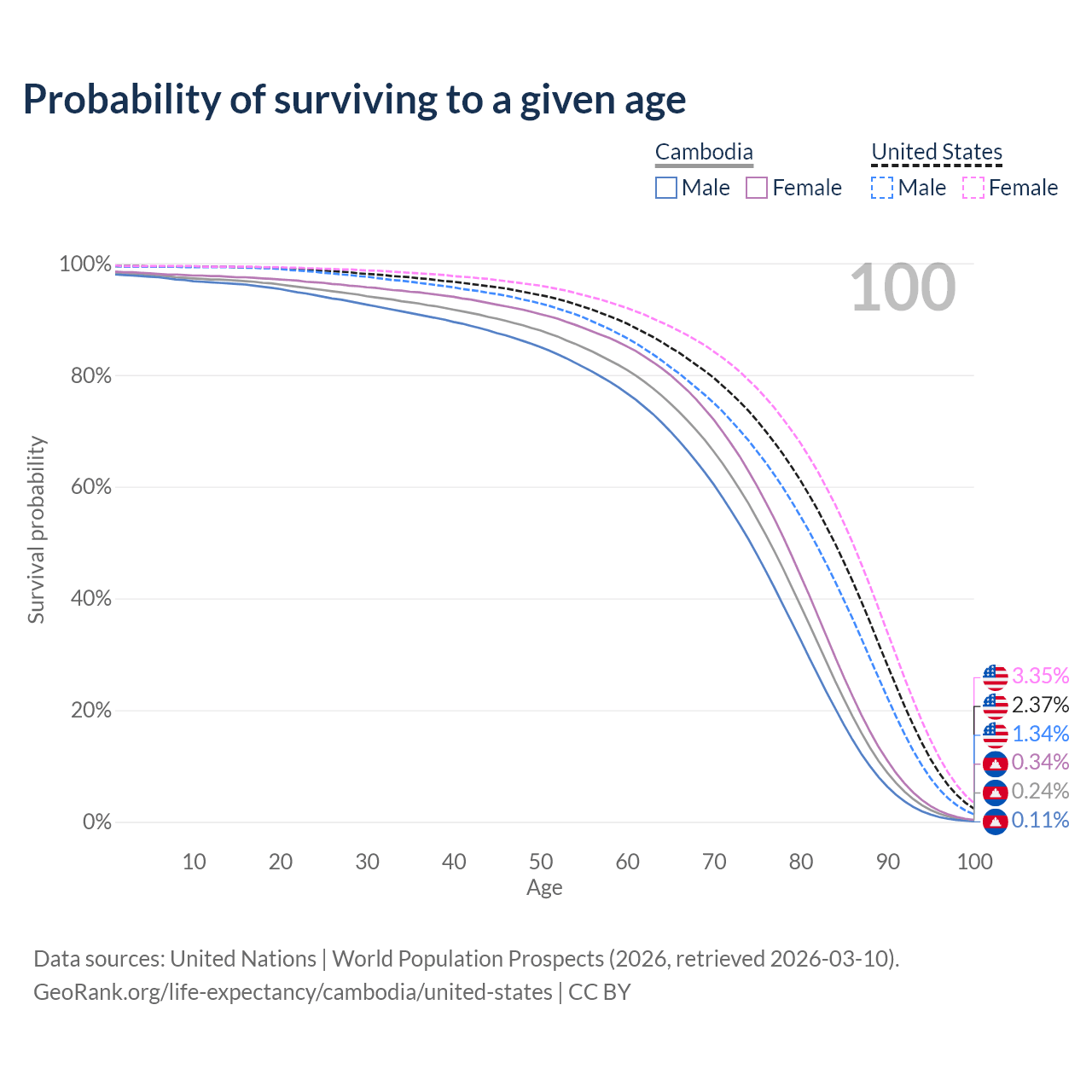 This life expectancy calculator shows the odds of living to 100, 95, 90, and below based on current age for both males and females in Cambodia and the United States, along with mean and median age of death. The calculations are based on the 2026 life tables (actuarial tables) from the UN World Population Prospects.