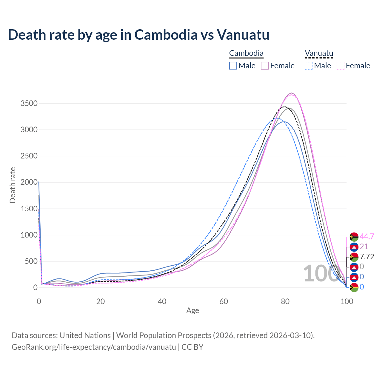 In Cambodia, the most common age of death is 81, compared to 80 in Vanuatu. The median age of death is 76.5 in Cambodia and 75.9 in Vanuatu, meaning only half of each cohort is expected to live past that age.