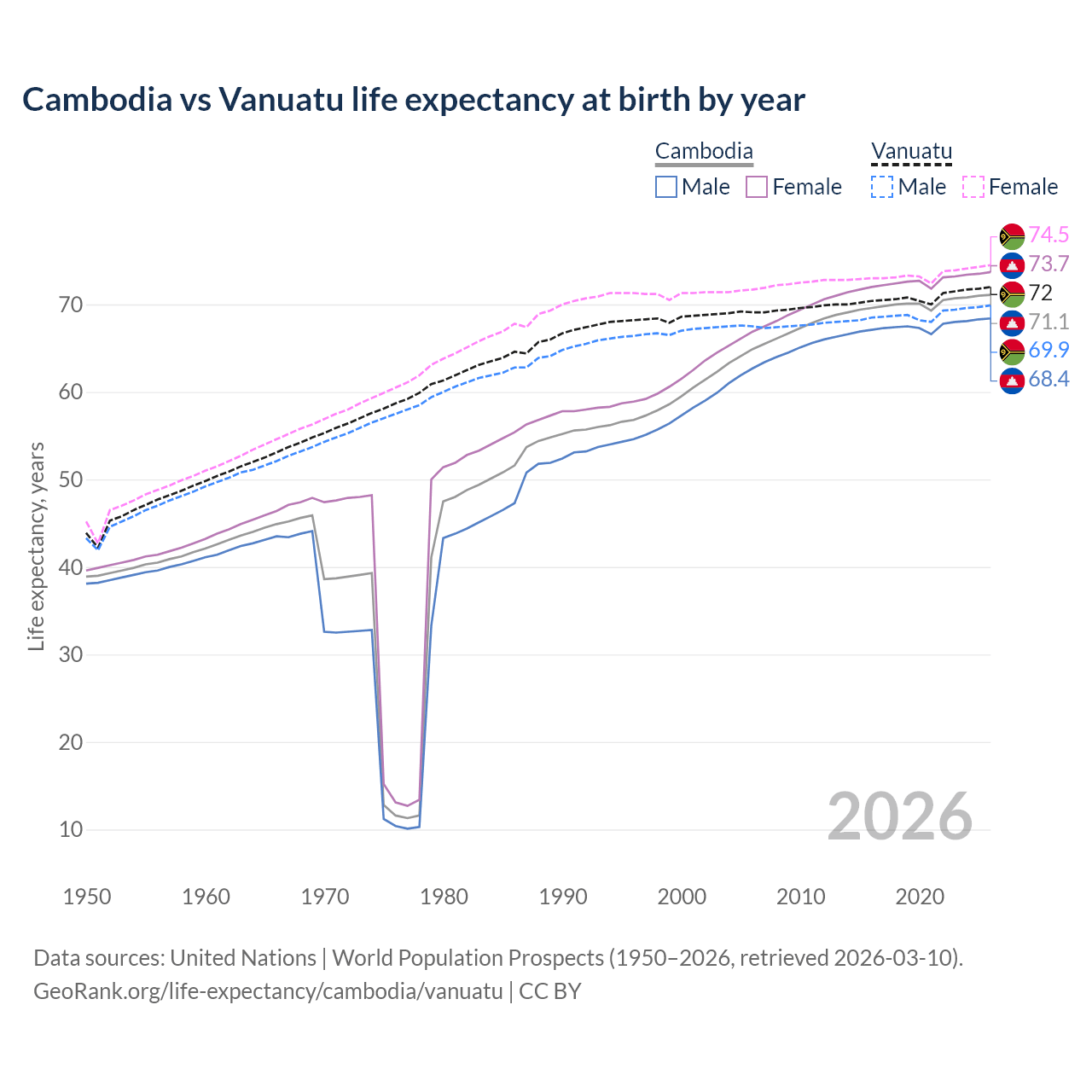 The average life expectancy at birth is 71.1 years in Cambodia vs 72 in Vanuatu. Cambodia is ranked 132/197 by life expectancy, and Vanuatu is 125/197. In Cambodia, the life expectancy is 68.4 years for males and 73.7 years for females. In Vanuatu, it's 69.9 years for males and 74.5 years for females.