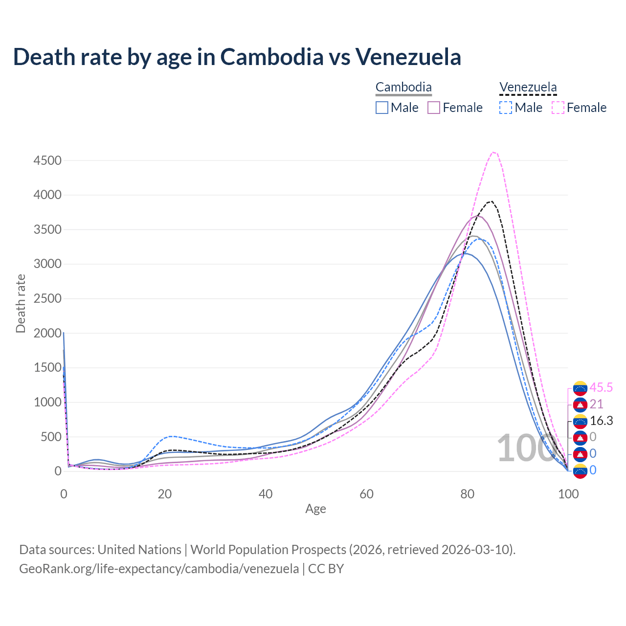 In Cambodia, the most common age of death is 81, compared to 85 in Venezuela. The median age of death is 76.5 in Cambodia and 79 in Venezuela, meaning only half of each cohort is expected to live past that age.