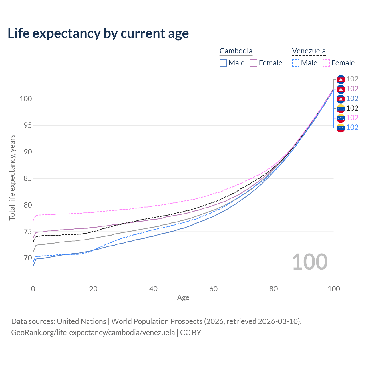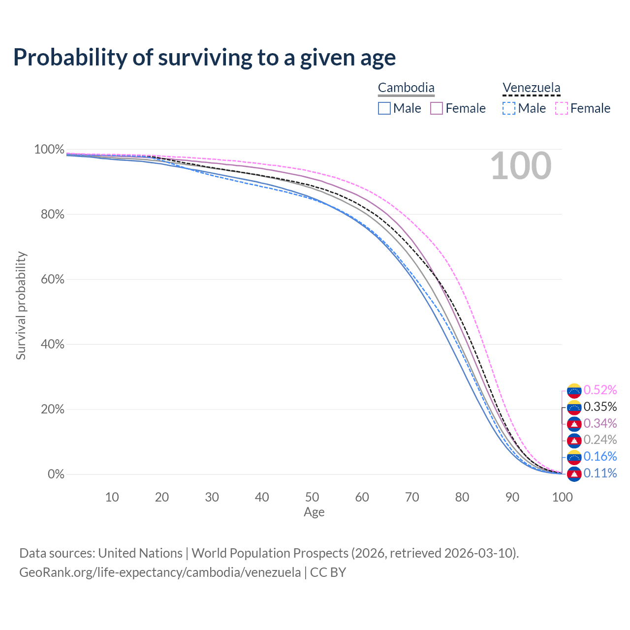 This life expectancy calculator shows the odds of living to 100, 95, 90, and below based on current age for both males and females in Cambodia and Venezuela, along with mean and median age of death. The calculations are based on the 2026 life tables (actuarial tables) from the UN World Population Prospects.