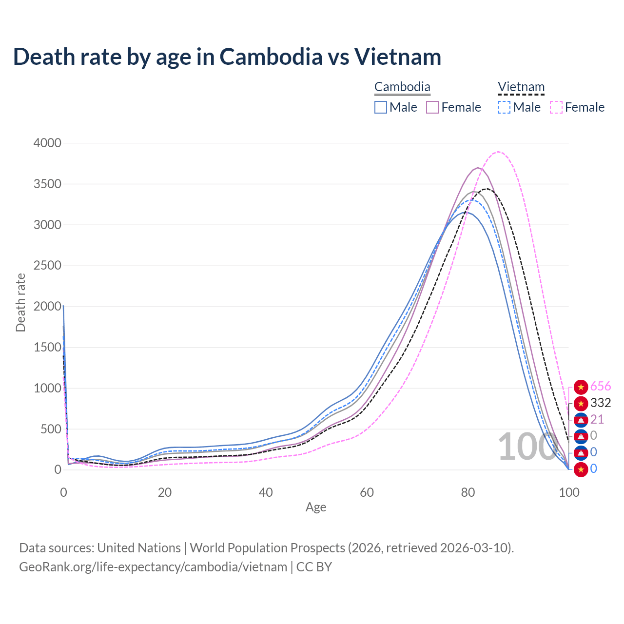 This life expectancy calculator shows the odds of living to 100, 95, 90, and below based on current age for both males and females in Cambodia and Vietnam, along with mean and median age of death. The calculations are based on the 2026 life tables (actuarial tables) from the UN World Population Prospects.