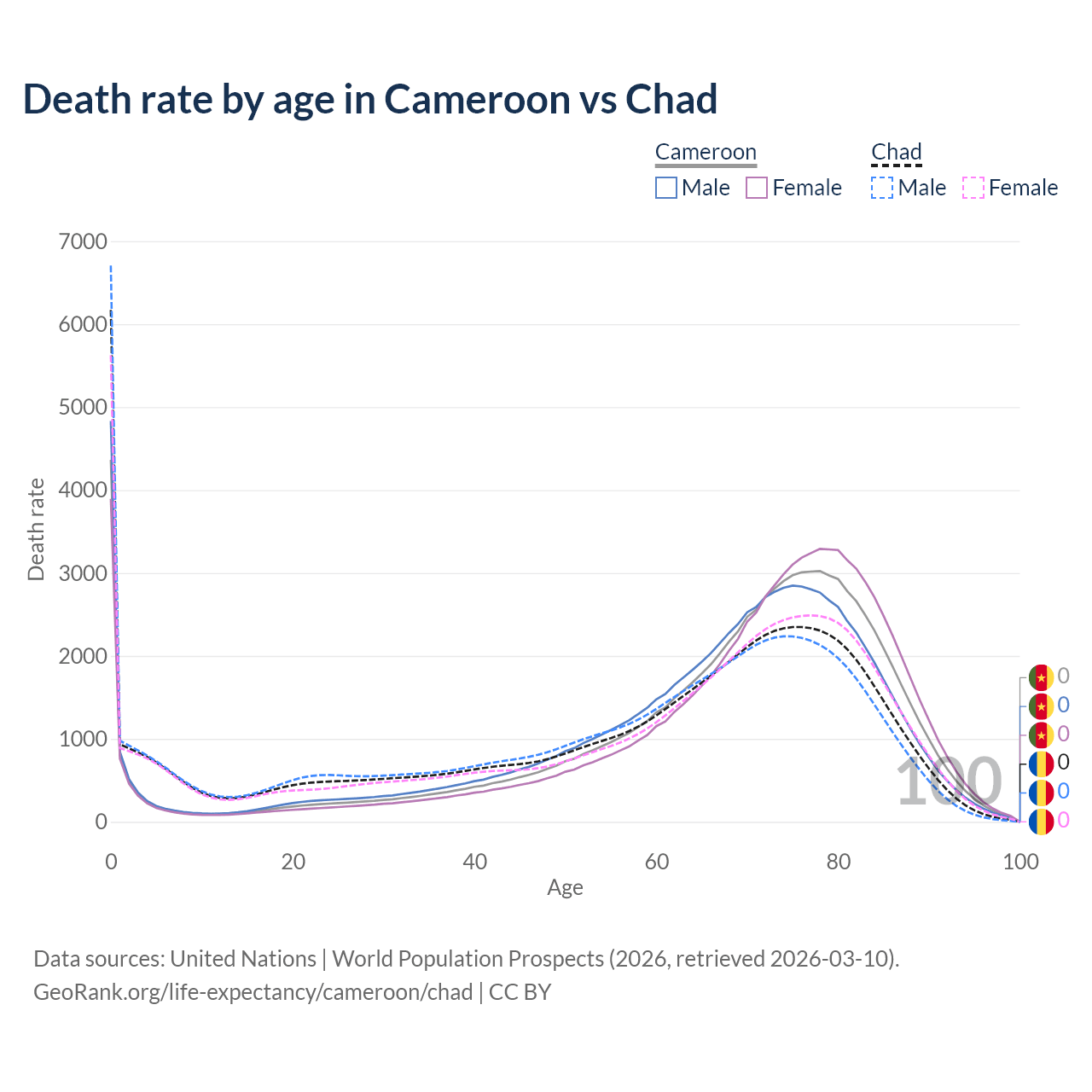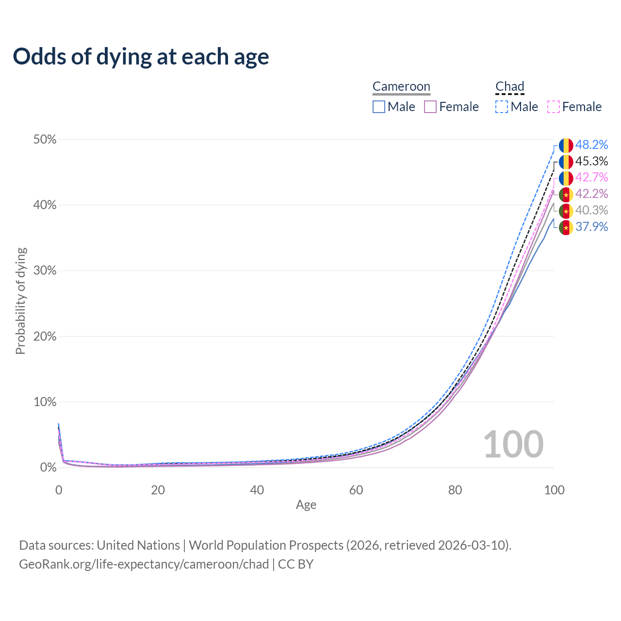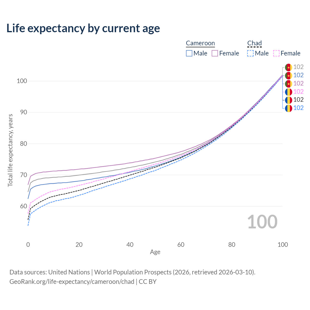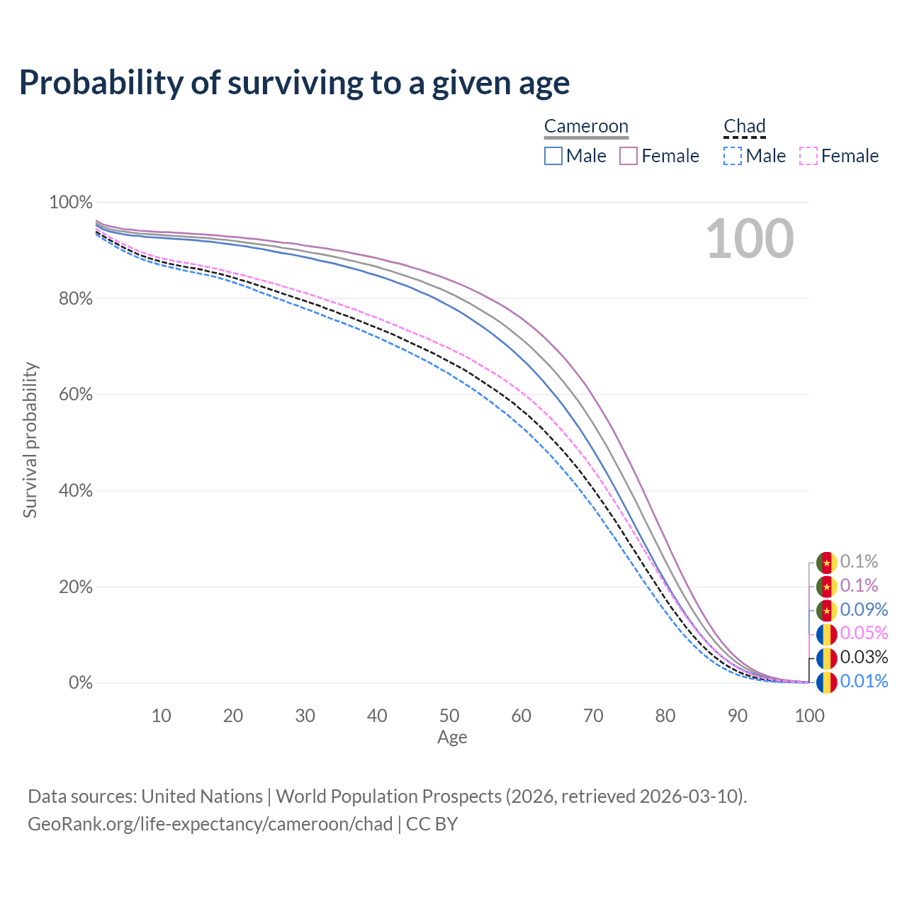 This life expectancy calculator shows the odds of living to 100, 95, 90, and below based on current age for both males and females in Cameroon and Chad, along with mean and median age of death. The calculations are based on the 2026 life tables (actuarial tables) from the UN World Population Prospects.