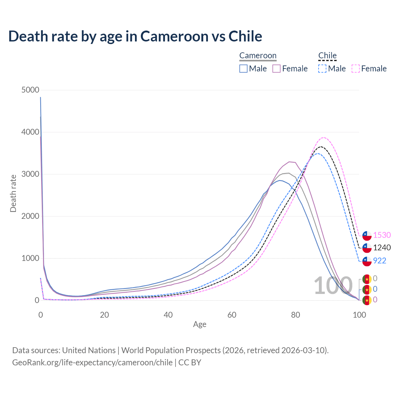 In Cameroon, the most common age of death is 0, compared to 88 in Chile. The median age of death is 71.6 in Cameroon and 84.8 in Chile, meaning only half of each cohort is expected to live past that age.