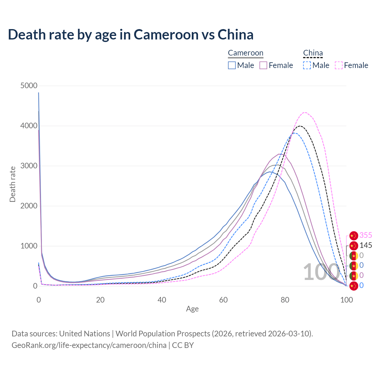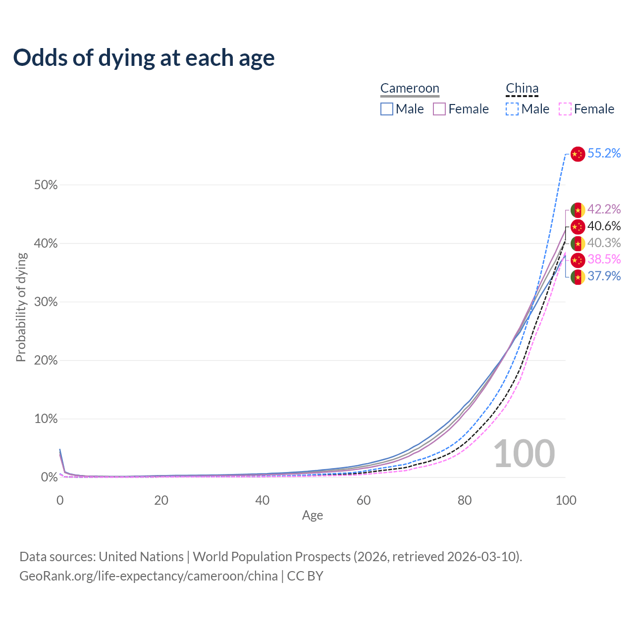 This life expectancy calculator shows the odds of living to 100, 95, 90, and below based on current age for both males and females in Cameroon and China, along with mean and median age of death. The calculations are based on the 2026 life tables (actuarial tables) from the UN World Population Prospects.